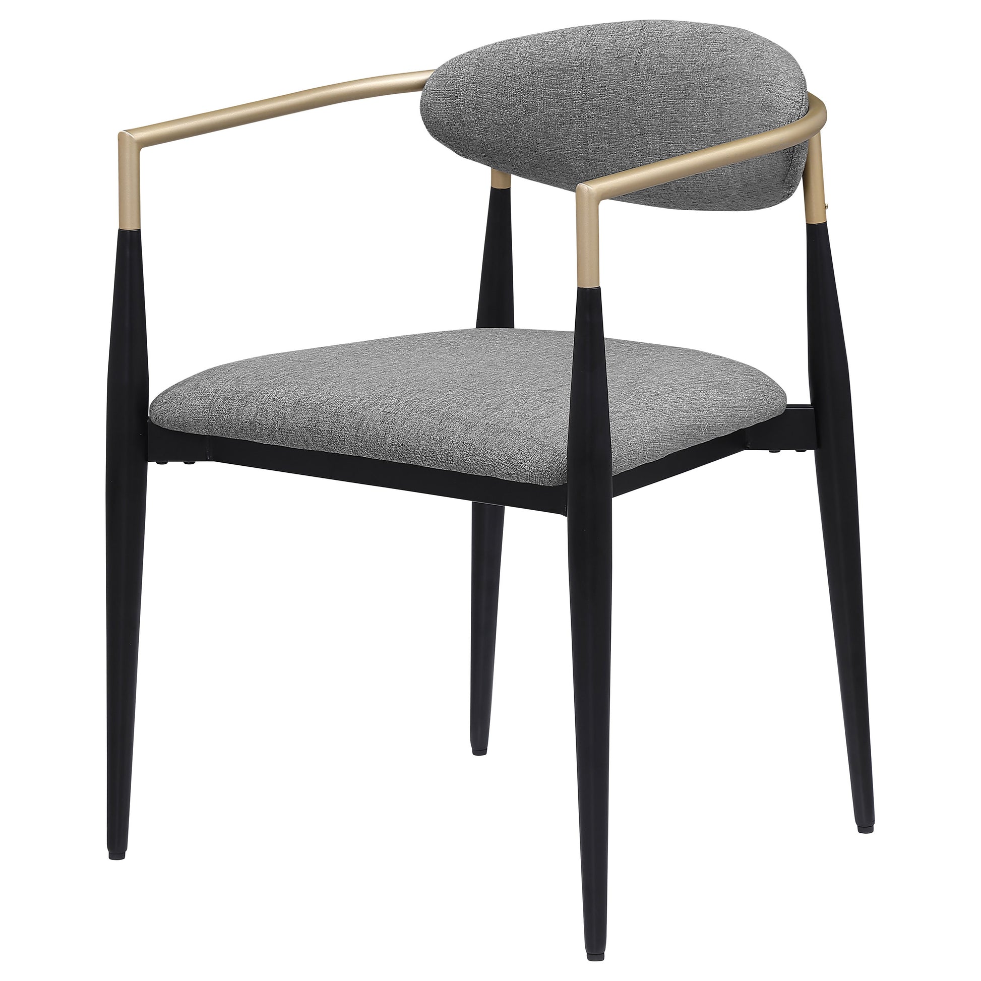 Refresh your dining table with the modern glam flair of a set of two armchairs. Perfect for family and friends, the chair offers impeccable comfort with a padded seat and an oval-shaped backrest with a gentle curvature for excellent support. Its metal frame offers stability and strength, complete with a black powder coated finish. A gold finish is hand-painted on armrests, adding gleaming metallic appeal and warmth. Each chair offers a slim, sleek silhouette, perfect for a modern or mid-century space.