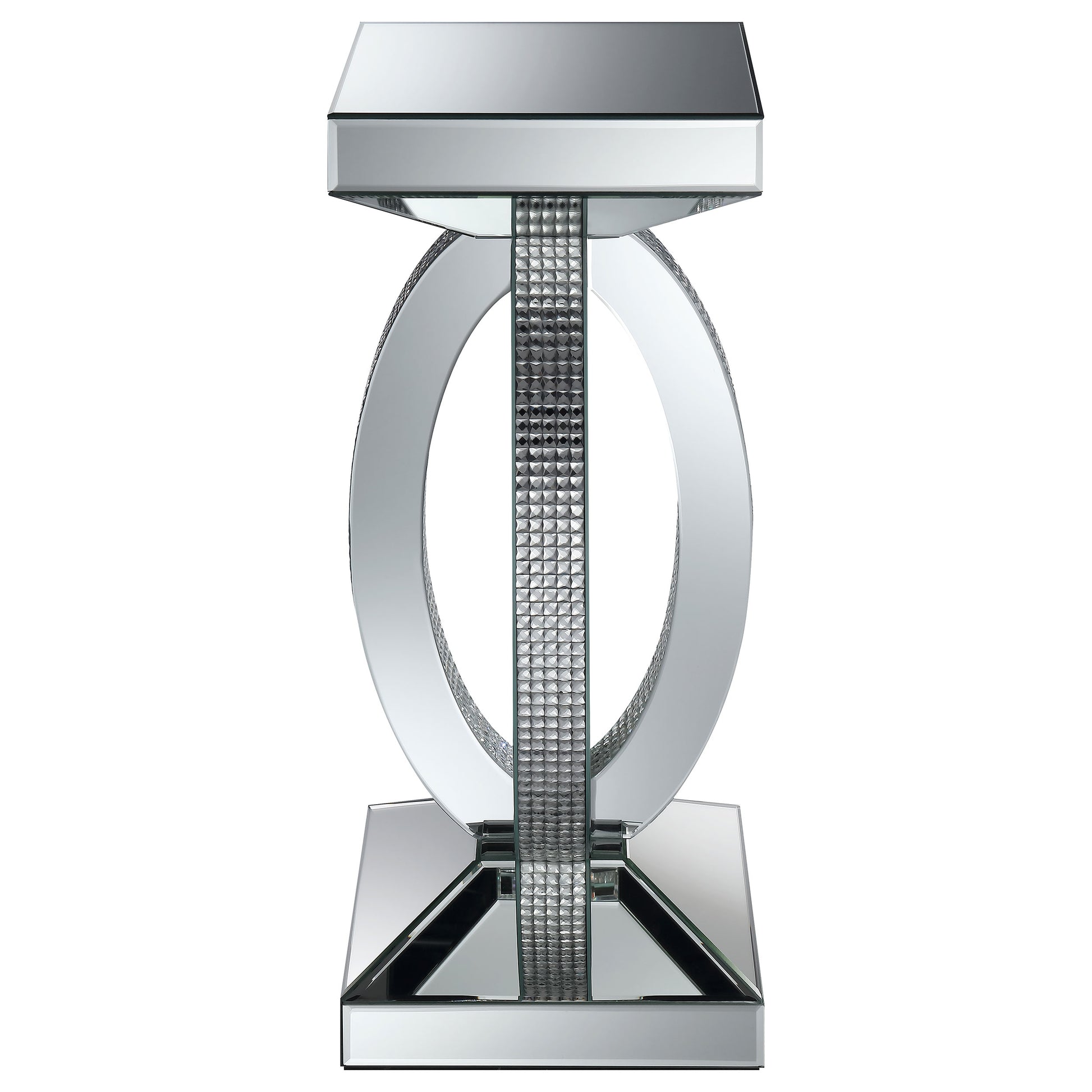 This coffee table set brings contemporary sophistication and modern luxury to your living space. Featuring a 40-inch square coffee table and a matching end table, each piece showcases mirrored surfaces and sculptural oval-shaped supports adorned with sparkling rhinestone accents. The coffee table offers a large top and base for symmetry, while the end table adds compact elegance. Perfect for displaying decor or hosting guests, this set is a captivating blend of style and functionality.