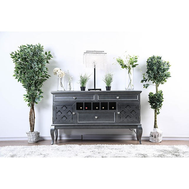 This dining collection will be the focal point of any home with its cool gray finish and elegant structure. This stunning server features on its front panels the same Moroccan-inspired inset patterns found on the matching table. Wine storage, drawers, and shelves provide storage for a stylish and functional piece.