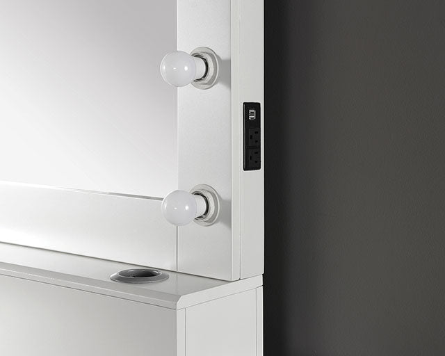 Lots and lots of drawers! There is a place for all of your jewelry in this brilliant piece. A series of bulbs line the edge of the matching mirror, with a six-inch base that can hold small items as you prepare for a night out.
