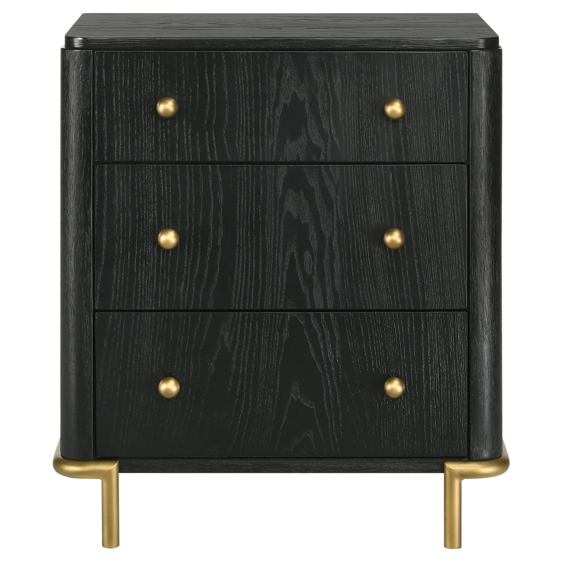 Put a fresh spin on your bedroom with the addition of a modern nightstand. Its three drawers provide plenty of storage at your bedside, great for books and personal items. The top drawer includes felt linking top protect important items, and a built-in USB port adds access for easily charging your phone overnight or while lounging in bed. The nightstand features a crisp black wire brushed finish that enhances its wood grain details, and gold finish ball knobs and legs add the perfect dose of contrasting warmth. Rounded corners soften the silhouette while a generous top is just right for a reading light or decor.