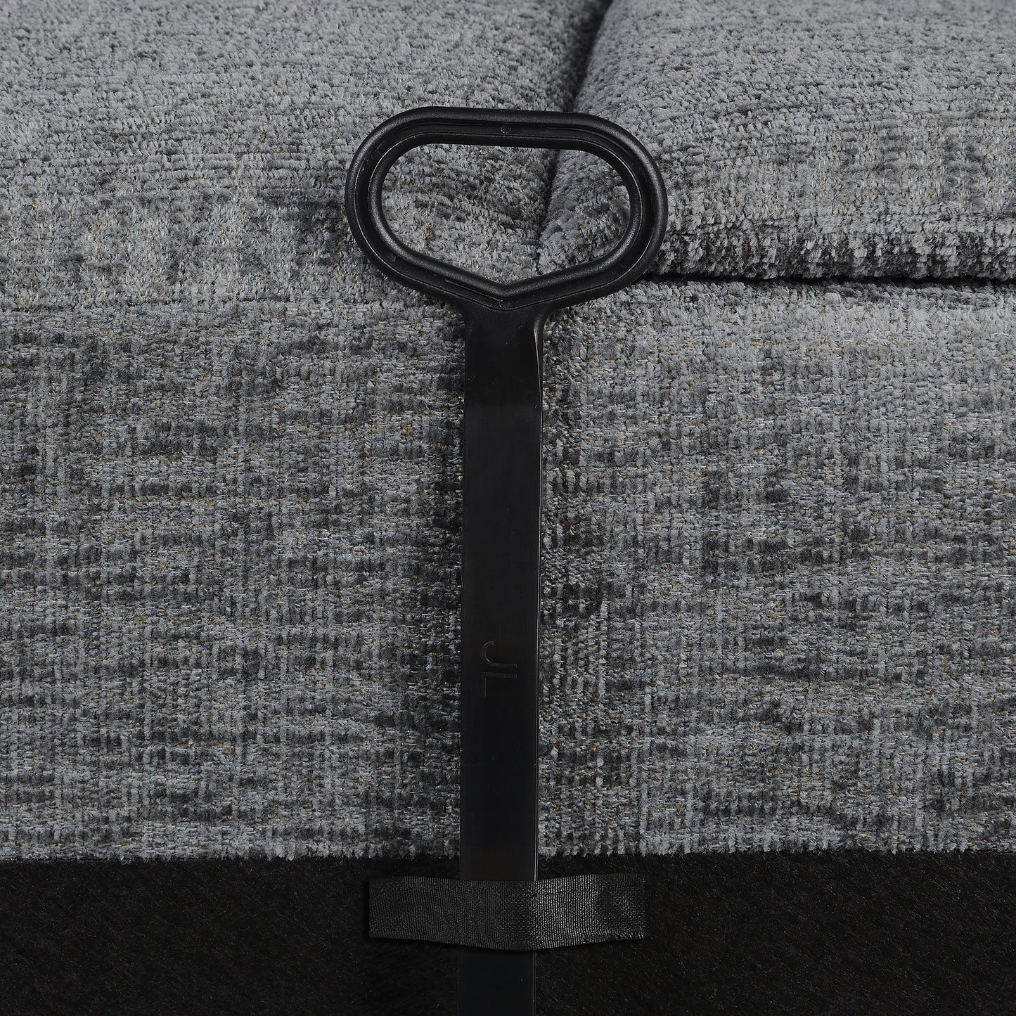 If you've ever dreamed of a movie theater experience in your living room, this three-recliner sofa just may be the answer. It features three recliners, each separated with a storage console that adds a pair of cupholders for fingertip accent to your favorite beverage. Stash charging cables, remotes and more in the consoles for easy access and a tidy space. On each end of the sofa, an extra-thick pillowtop armrest is perfect for curling up. The sofa features plush cushions and supportive seating, all in charcoal gray upholstery that adds neutral color to complement surrounding decor.
