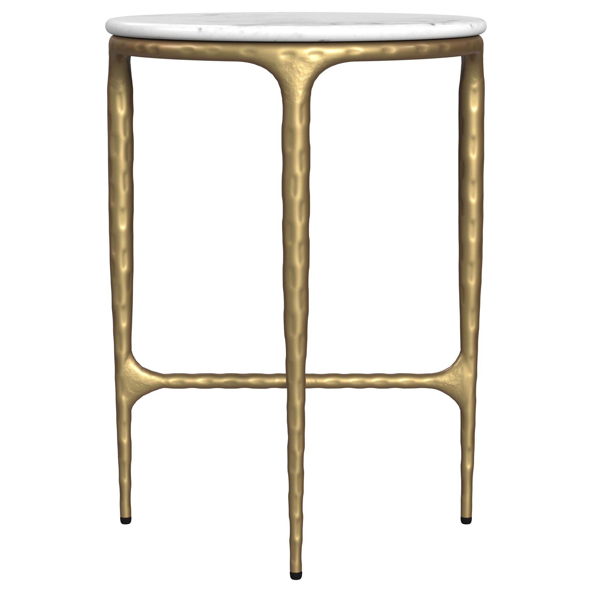 Introduce an artistic touch to your home with this stunning round side table, where luxurious materials and sculptural design meet. The table boasts a genuine white marble top that sits gracefully atop a hand-hammered steel frame with a rich gold finish. The organic texture of the frame adds an intriguing contrast to the smooth marble, offering a piece that’s both functional and visually striking. Perfect for contemporary and eclectic interiors, this round side table arrives fully assembled, making it an effortless addition to your living space.