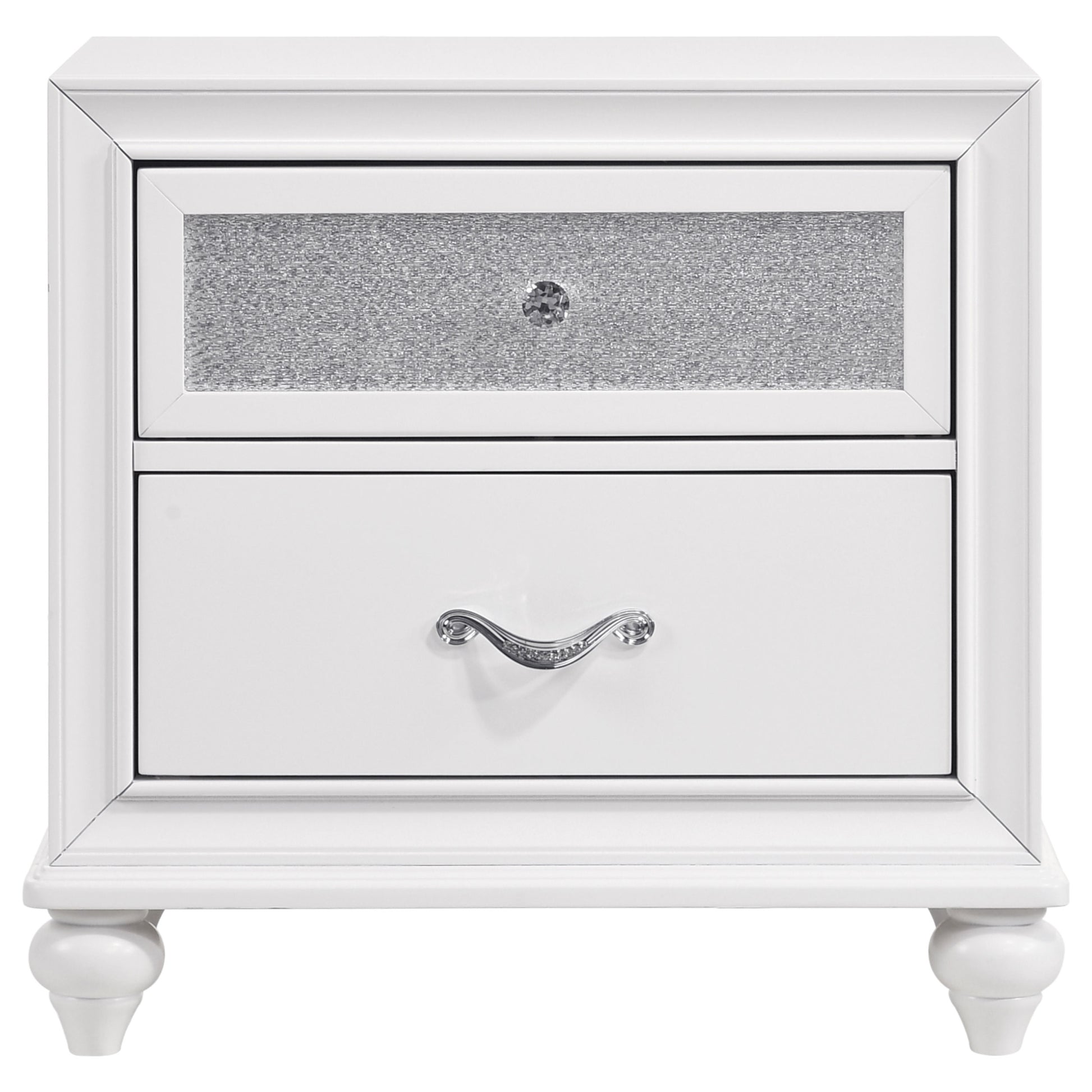 Transform your bedroom with the elegant design of this white set. The panel bed showcases metallic leatherette channel tufting framed by crisp molding and finished with turned feet for timeless charm. Coordinated storage brings added sparkle with glittery acrylic panels and faceted crystal hardware, blending modern radiance with classic details. Sculpted bun feet complete the look, while solid rubberwood, engineered wood, and okume veneer provide durability for lasting beauty and function.