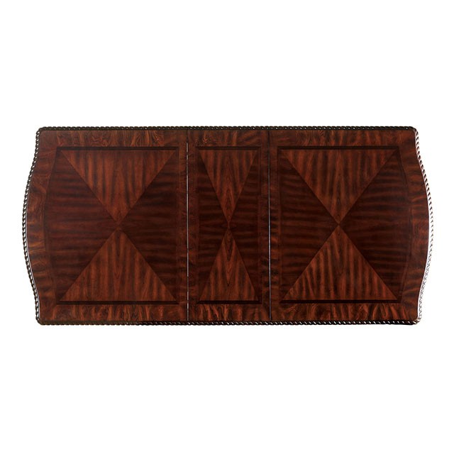 The centerpiece of this set is the beautiful pedestal table, which comes in two styles, adorned with intricate designs on the base and the apron. Three options for the side chairs are offered, as well as a matching mirror and server finished in brown cherry.
