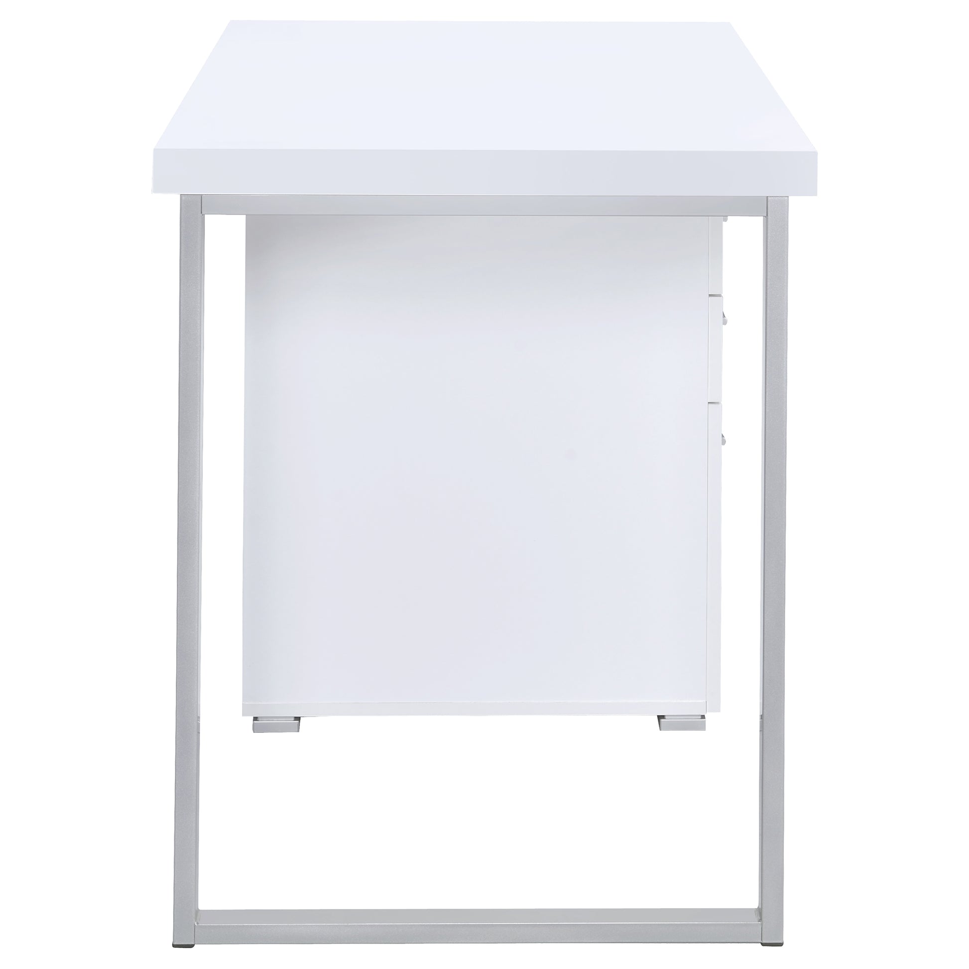 Streamline your workspace with this modern office desk that combines function and style. Supported by a sturdy silver metal frame, the design features a spacious work surface along with two storage drawers and a file cabinet that accommodates both legal and letter-sized documents. A reversible configuration allows you to set up the storage pedestal on either side, providing flexibility for any layout. Crafted with engineered wood and laminate veneer, this desk balances durability with sleek contemporary appeal.