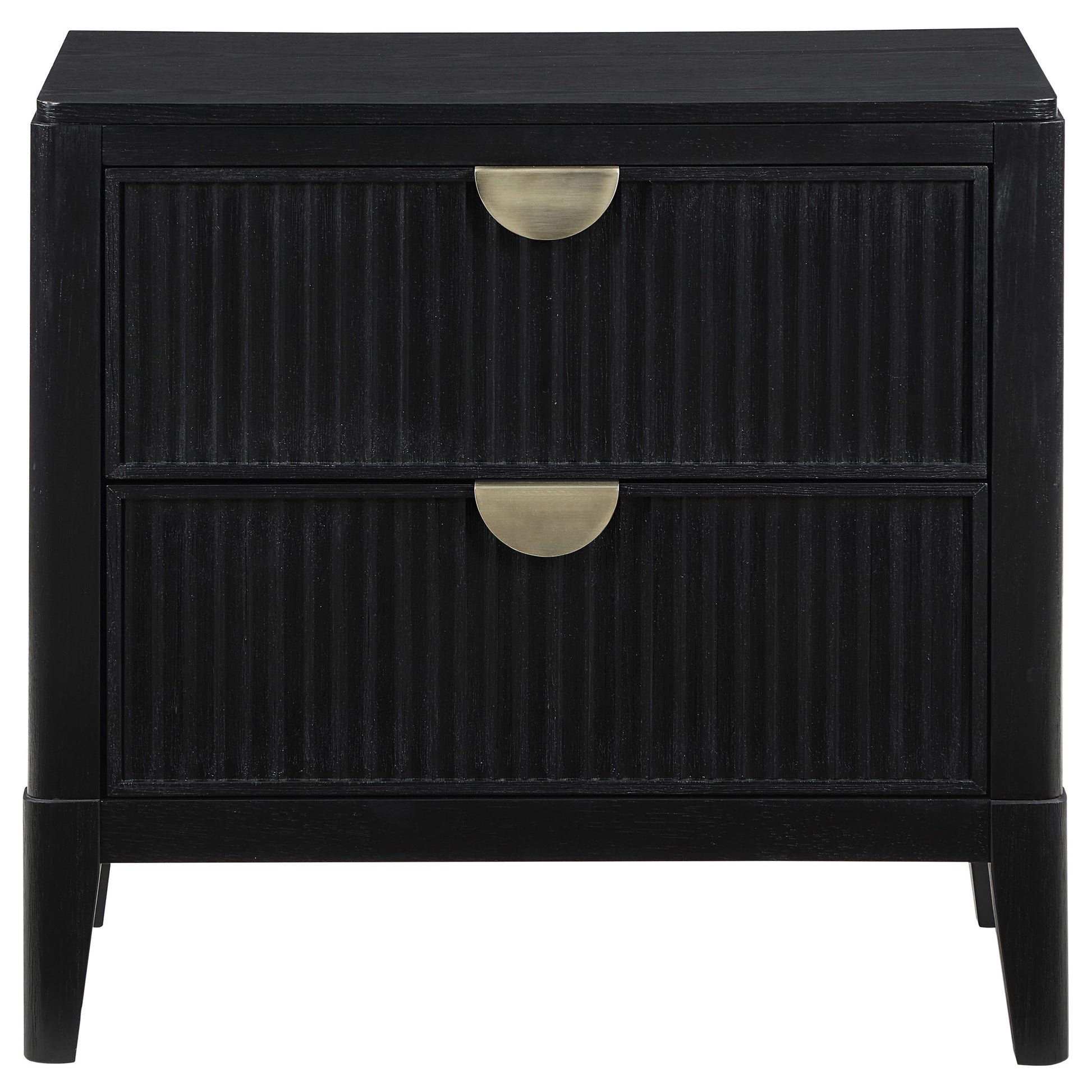 A rich black finish create a sophisticated palette for a four-piece modern bedroom set. Complete with wire brushing that creates texture, the set features fluted details that add elegance and character. The bed features an open silhouette with a low footboard, while a tall headboard centers your space. A two-drawer nightstand includes a felt lined top drawer to protect delicates like your watch or phone, leaving plenty of space in the bottom drawer for books and other essentials. The dresser and mirror set completes the look, offering plenty of storage in eight drawers, including felt lining in the top two, for clothing and accessories.