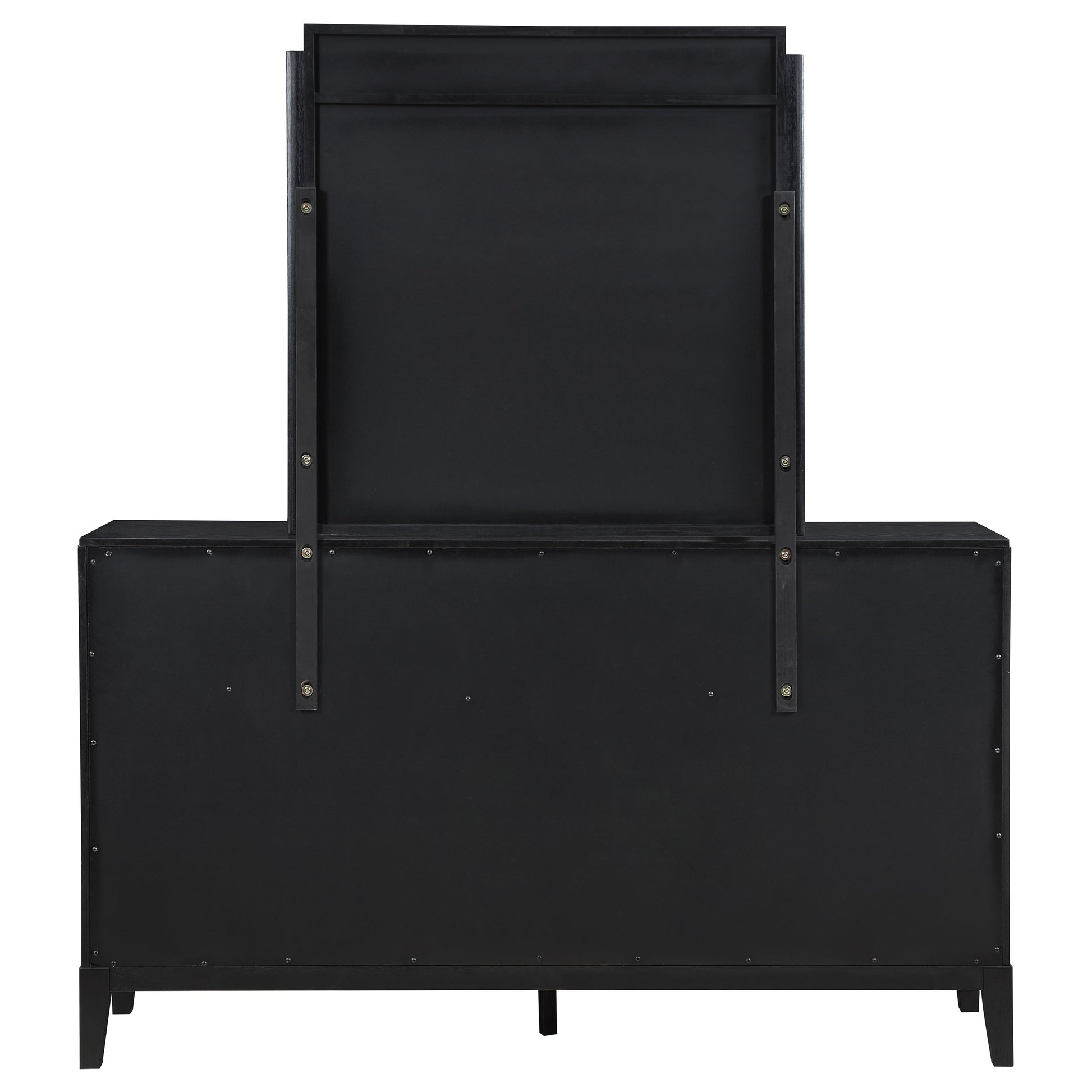 Dress up your bedroom with the impeccable texture and styling of a modern eight-drawer dresser and mirror. Vertical fluting decorates each drawer front and crowns the mirror, offering a refined, artistic touch that elevates without overwhelming. A black finish is rich and deep, perfect to blend with a variety of existing decor and furniture pieces. Its drawer fronts feature vertical fluting details and half-moon handles in a golden finish, delivering the perfect blend of contrast and texture. A framed mirror on top completes the look and offers reflectivity and depth in your bedroom.