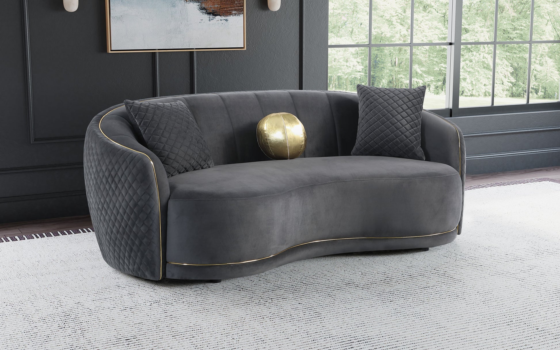 Encourage sophisticated aesthetics with the refined silhouette and gorgeous gold trim featured on a modern sofa. Upholstered in dark gray, it boasts a gently curved kidney silhouette that creates a rich, inviting ambiance in your living room. Its sloping arms and curved front are trimmed in gold, with a matching round accent pillow that brings exceptional style and dimension. The outer surface adds diamond quilted texturing, while vertical channel tufting adds texture to the inner back and arms. A pair of accent pillows in matching dark gray complete the look, offering easy comfort for lounging and entertaining.