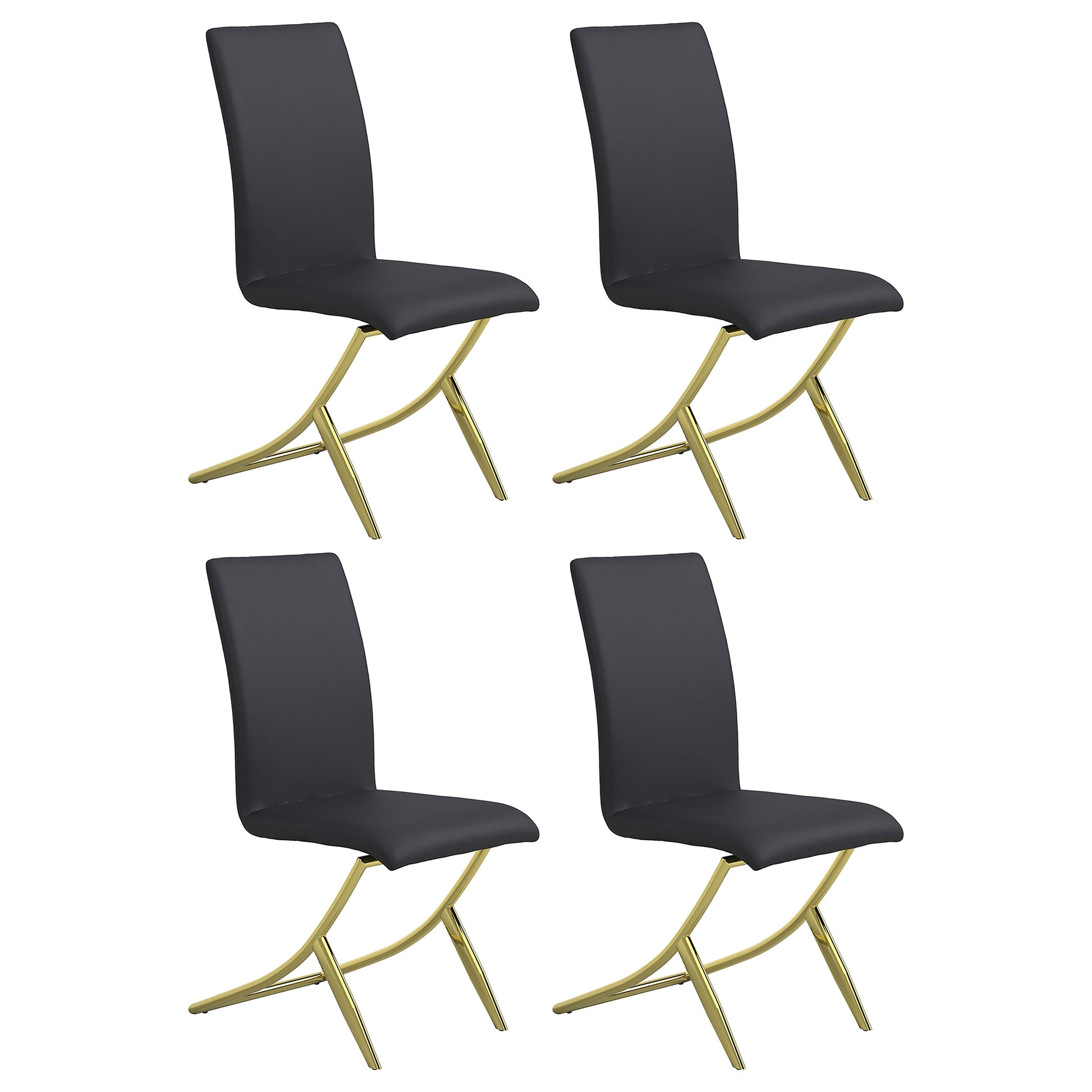 Add bold sophistication to your dining area with this contemporary side chair in black leatherette. Designed with clean lines and a sculptural brass metal base, it delivers striking modern elegance. The high back and plush padding provide comfort, while the armless design keeps the silhouette sleek. Pair it with a glass or lacquered table to complete the upscale look.