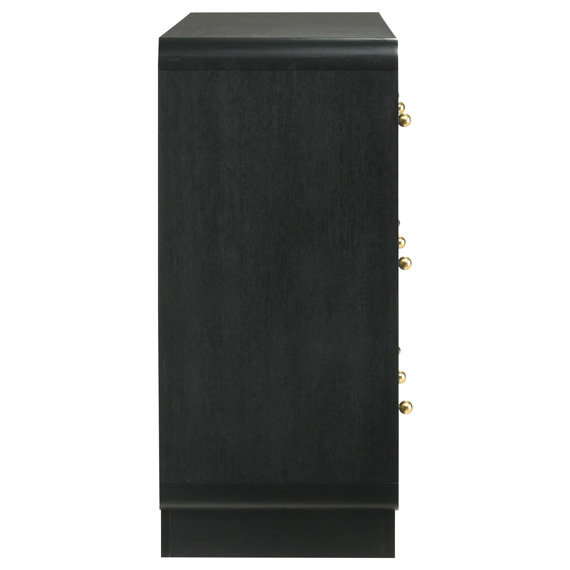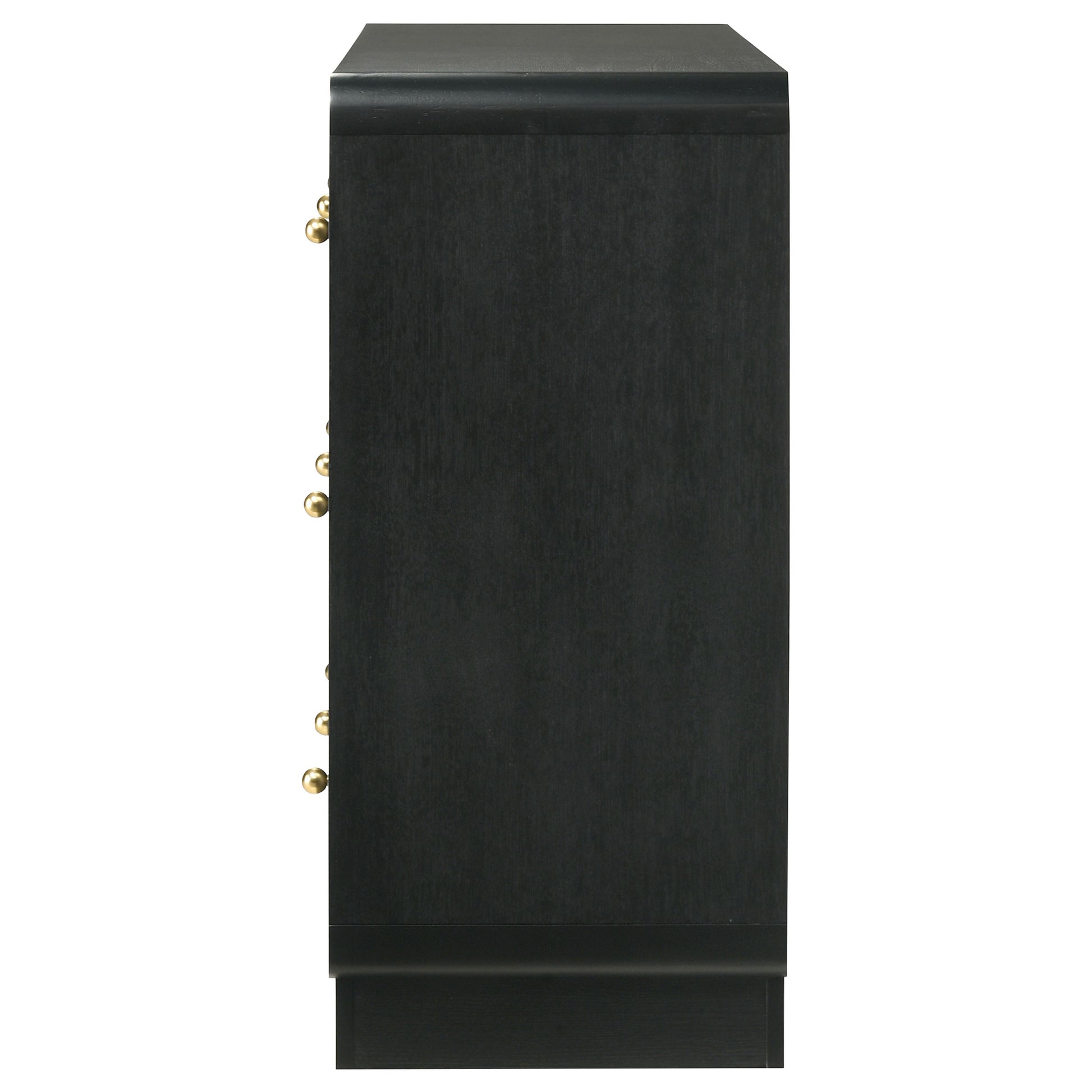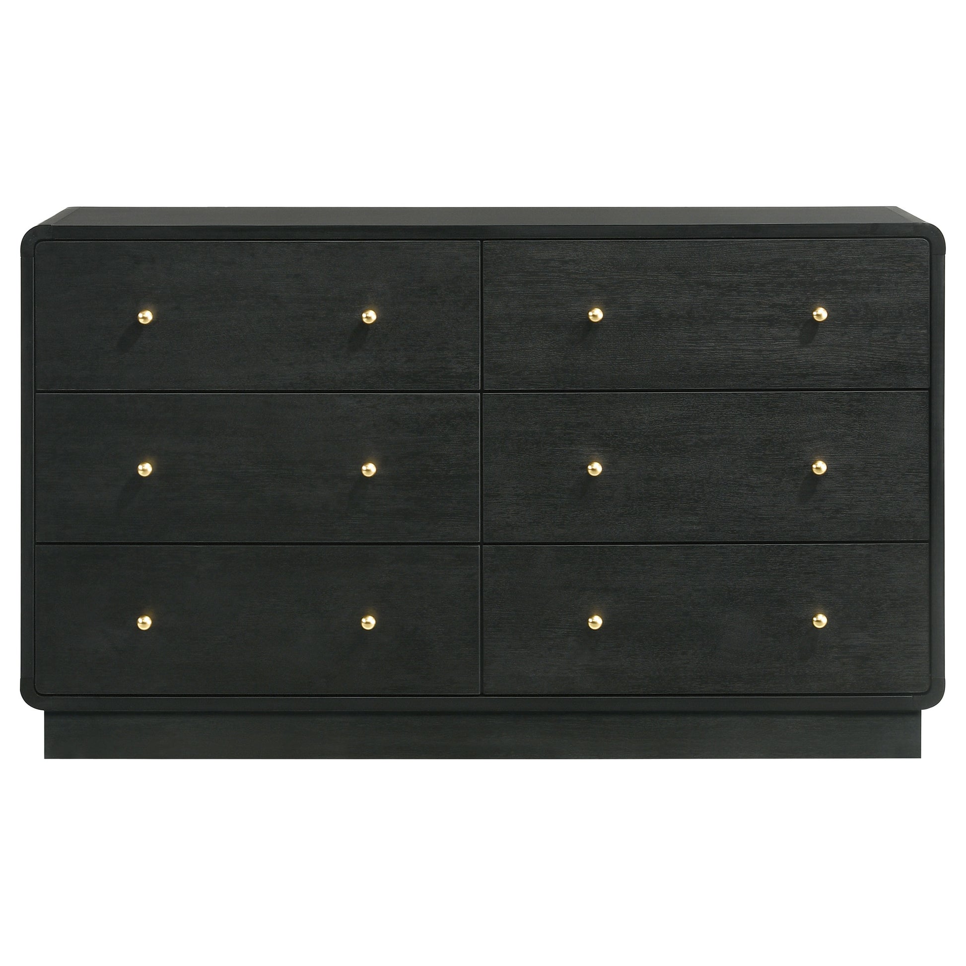 Complement a stylish bedroom with the abundant storage featured in a modern six-drawer dresser. Delivering a sophisticated presentation, it boasts a black finish over melamine surfaces that resist damage to remain looking their best. Ball knobs complement each drawer front, standing out with a rich, warm brass finish. The case of the dresser features rounded corners, softening the overall presentation of the dresser. A wide top is ideal for jewelry boxes and decor that lends a personalized touch.