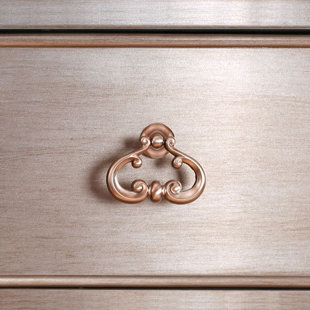 Feminine details and luxurious designs come together to form this elegant bedroom set. Featuring an extravagant gold finish to go with the padded and tufted headboard, this bed exudes royalty. Nailhead trim completes the regal appearance and a low footboard adds a touch of contemporary influence. Added utility with the power outlet hidden within the nightstand ensures this sophisticated set is not just easy on the eyes but also convenient and functional!