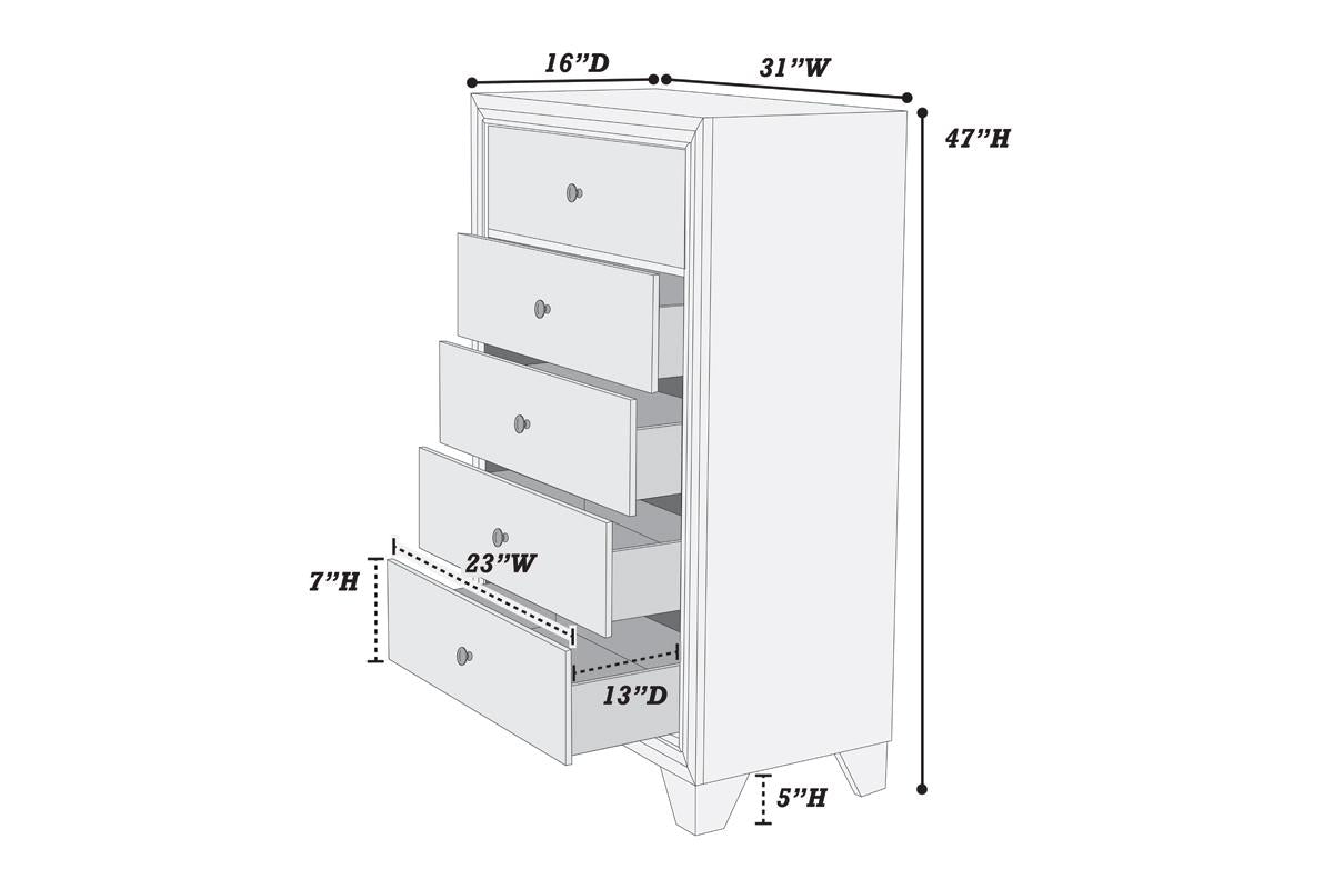 This chic masculine five piece bedroom set is design to immediately transform your bedroom into a designers’ living space. Using blue grey and black, it keeps the color palette consistent and tasteful. The set includes Queen/CA King/E King size bed frame, nightstand, chest, dresser and mirror. It provides ample storage space, that will help you keep your room organized. The dresser and mirror combination also function as a vanity, so you can comfortably get ready in your own room. Allow this exquisite set to bring out your character.