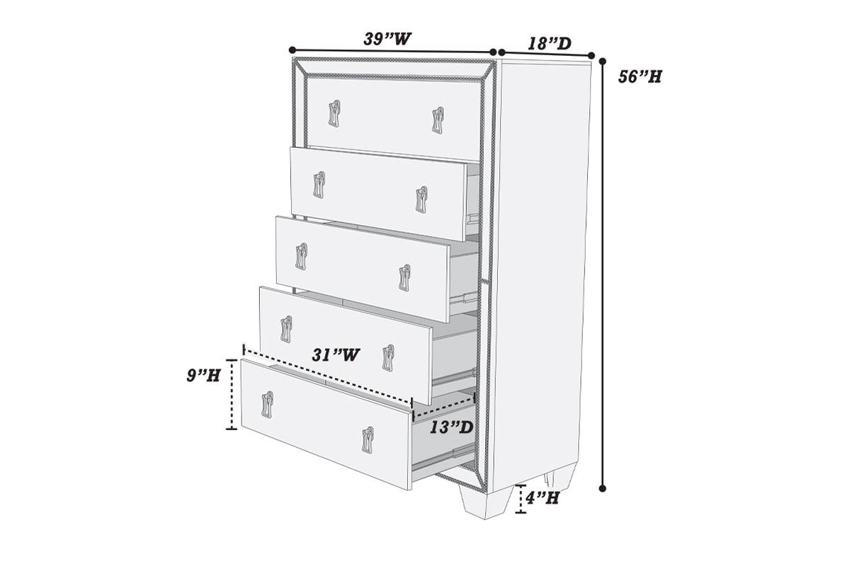 This bedrom set featuring a silver luxurious faux-leather with button tufting, mirror accents with two storage drawers and large scale are all key features of this stunning beds. Add glam to any bedroom with this design. The set includeds optional Queen/CA king/E.King bed frame, nightstand, chest, dresser and mirror.