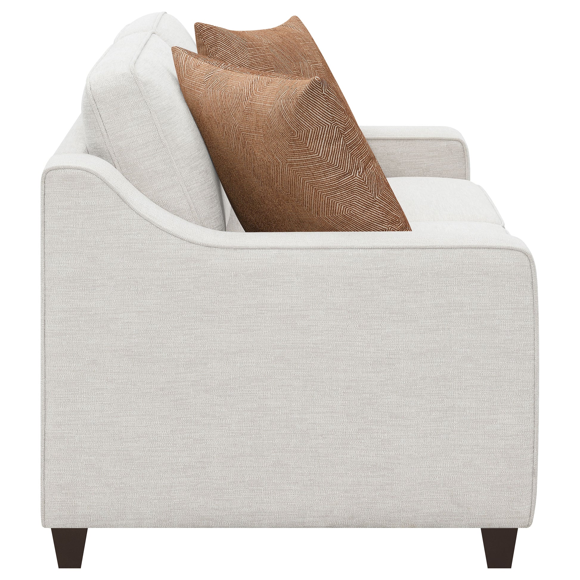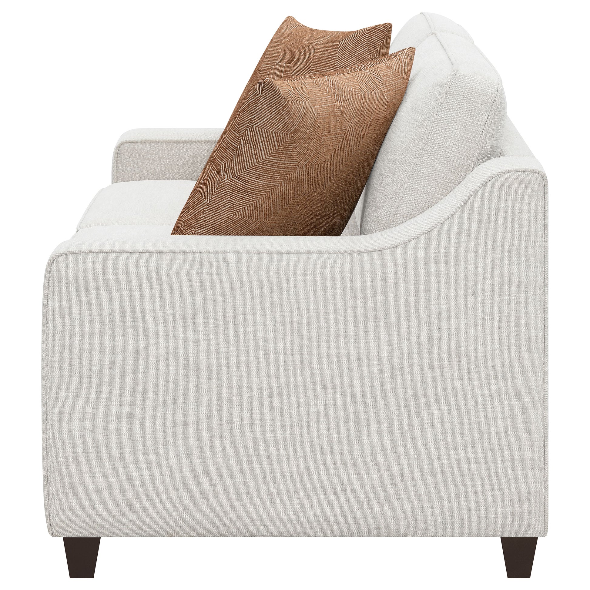 Elevate your living space with this upholstered loveseat, wrapped in soft beige chenille for a cozy yet refined look. Designed with sloped track arms and tapered dark brown wooden legs, it offers a balanced blend of comfort and sophistication. Boxed seat and back cushions with classic welt trim highlight its tailored design, while coordinating accent pillows in copper and coral hues add a subtle touch of contrast. Ideal for modern or transitional interiors, this loveseat provides timeless style and inviting comfort.