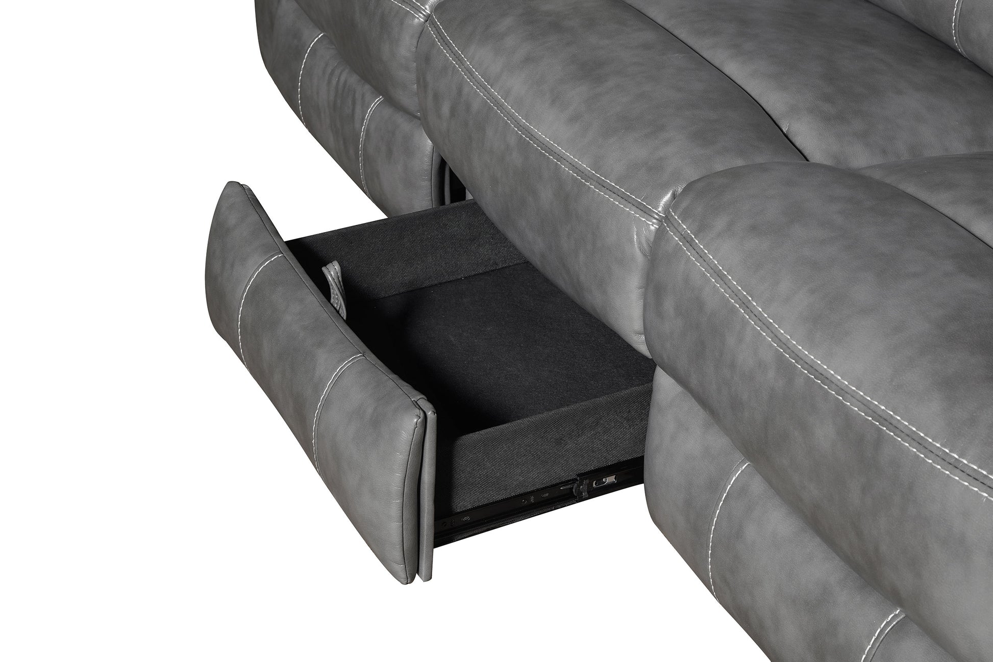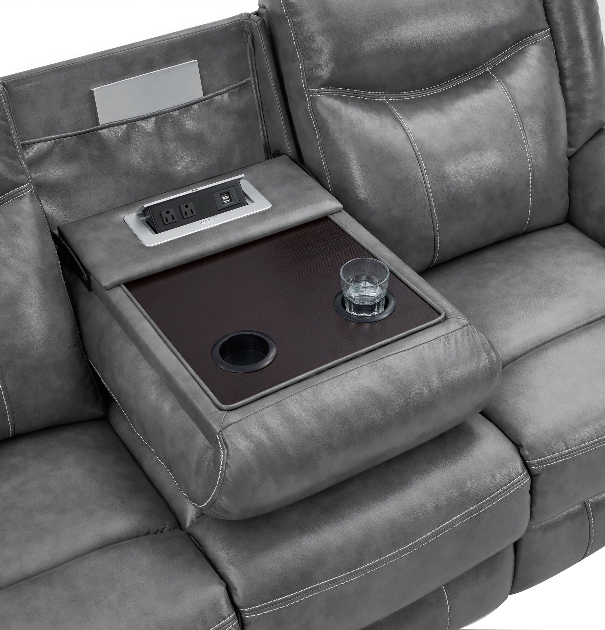 Experience the perfect blend of comfort and functionality with this reclining sofa set, upholstered in smooth grey faux leather for a contemporary appeal. Designed for relaxation, each piece features plush cushioning, padded headrests, and supportive armrests. The collection includes thoughtful upgrades like drop-down tables with cup holders, power outlets, hidden storage, and cool gel memory foam seating. Built with durable metal and plywood framing, this set redefines everyday comfort in modern living spaces.