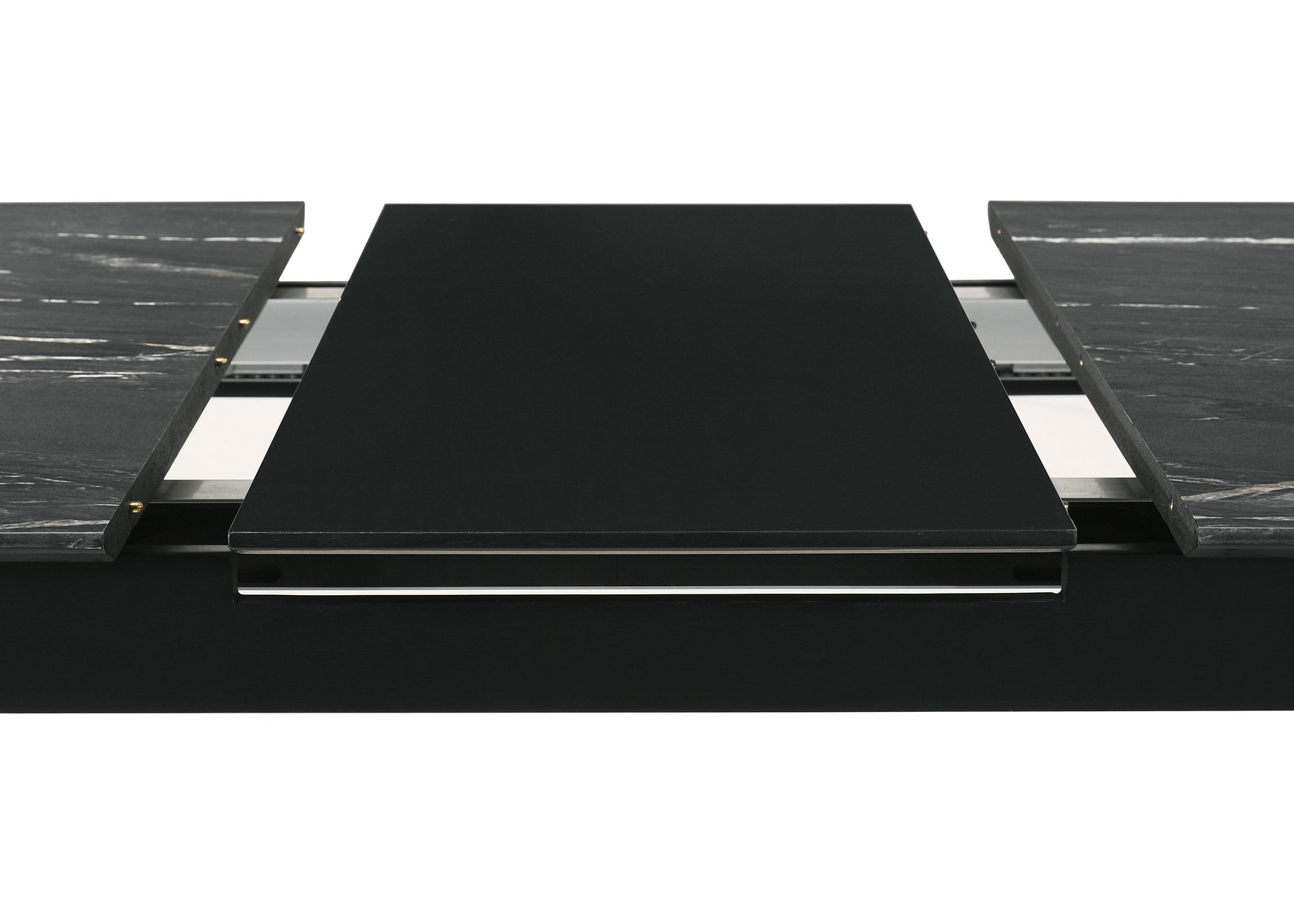 The luxurious look of faux marble creates a glam sensibility for a modern dining table. The black marble look of the tabletop complements a sleek base with fin-style legs and a recessed apron. The table includes a self-storing leaf for easy expansion to accommodate guests or the family. Its black base finish is crisp and classic, offering timeless elegance that never goes out of style. It's the perfect way to bring fresh, modern energy to your dining room.