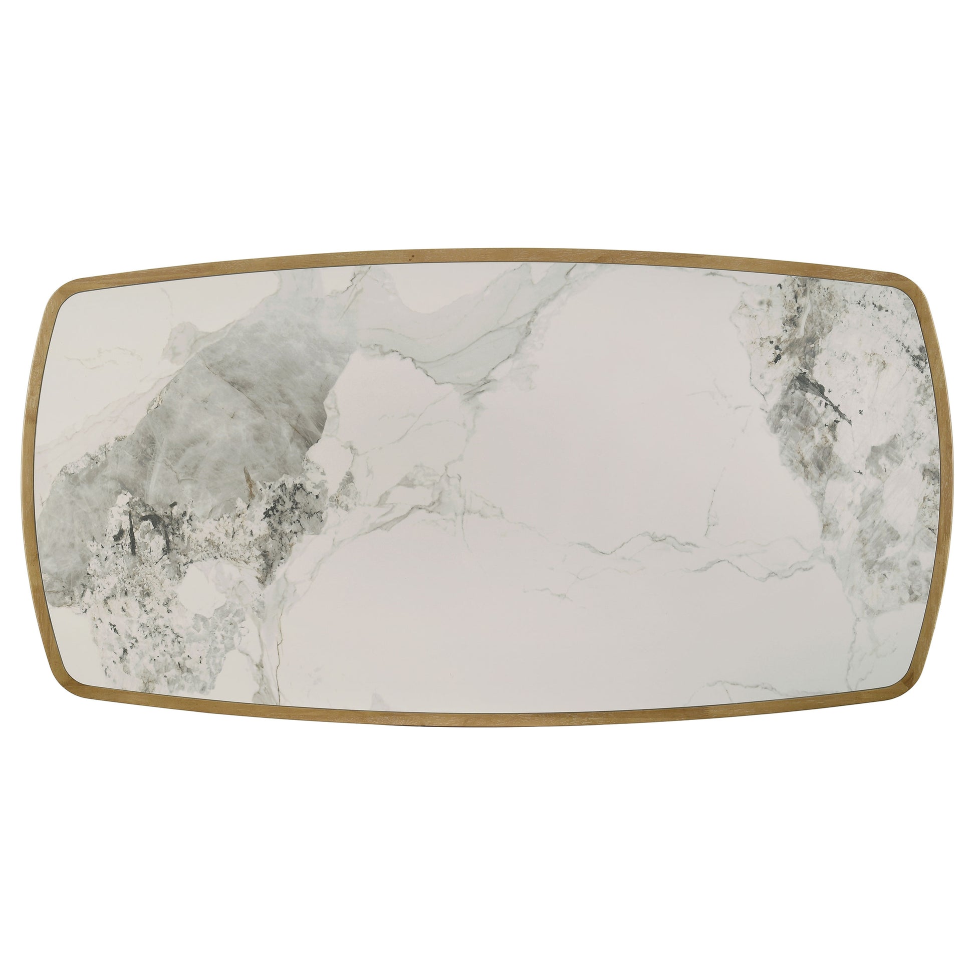 This mid-century dining set combines sculptural elegance with practical performance. The fixed-top table features a recessed ceramic surface with marble-like tones framed in solid wood, offering an impermeable, heat-resistant, and easy-to-clean finish. Slatted angular legs add architectural flair. The side chairs provide plush grey upholstery, curved backrests for support, and gently rounded frames. Crafted for comfort and durability, this set seats six with effortless style.