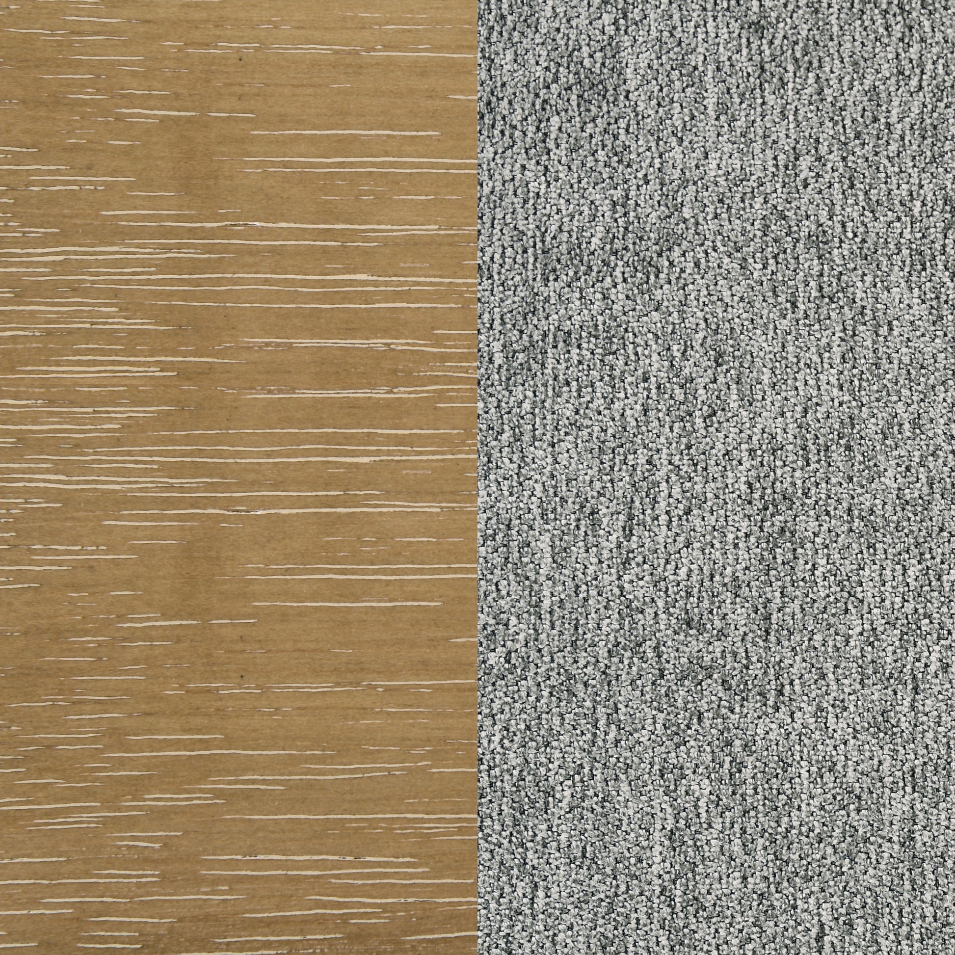 • Chairs feature plush grey fabric and rounded posts for comfort and subtle detail