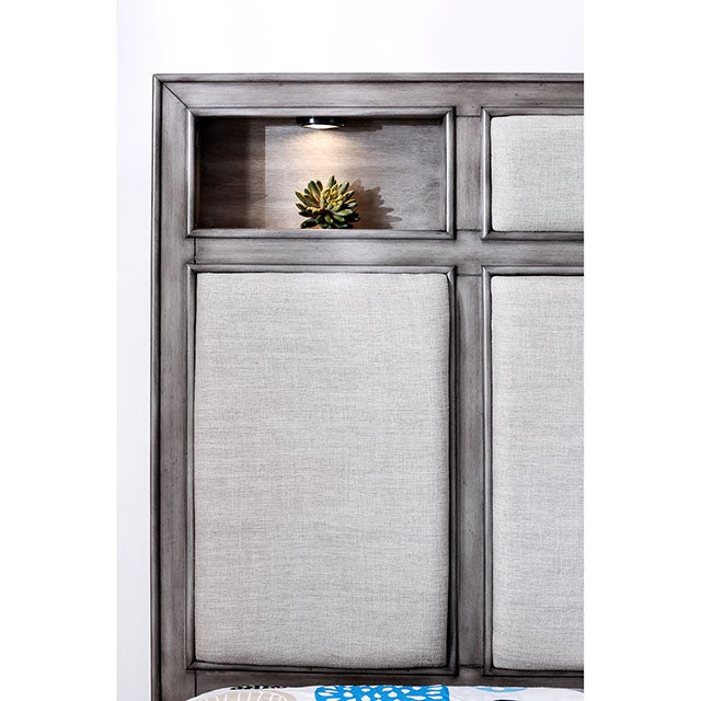 In addition to stunning carved details and felt-lined top drawers, this transitional style bedroom collection comes with built-in headboard shelves and convenient touch lights. An extra drawer hides within the night stand and dresser while the chest offers extra functionality with its lift-top jewelry storage, complete with mirror. Sleek silver tone handles sparkle against the weathered gray finish for a beautifully contemporary design that will beautify any bedroom.