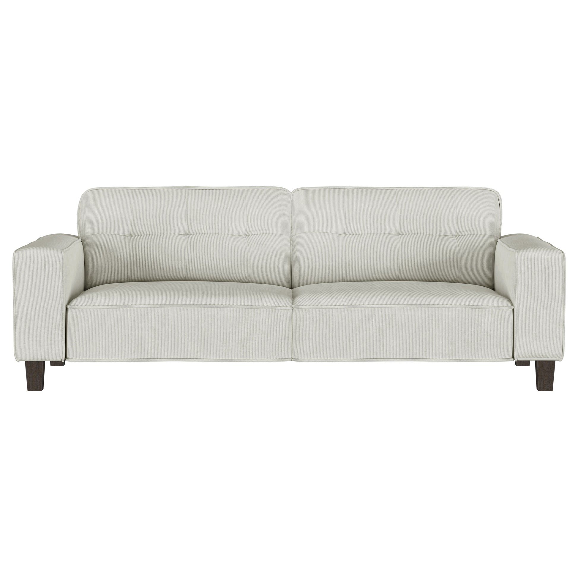 Infuse tailored elegance with the tufted details of a modern sofa set. Featuring a three-seat sofa and two-seat loveseat, this set offers a refined anchor for your living room seating. Smooth, soft upholstery adds neutral color, while plush foam and sinuous springs ensure optimal comfort. The sofa and loveseat each feature tufted back cushions, offering a refined touch of mid-century charm. Track arms define a straight, clean-lined silhouette that's simply timeless and each piece stands on dark brown finished tapered wooden legs that add airy height.
