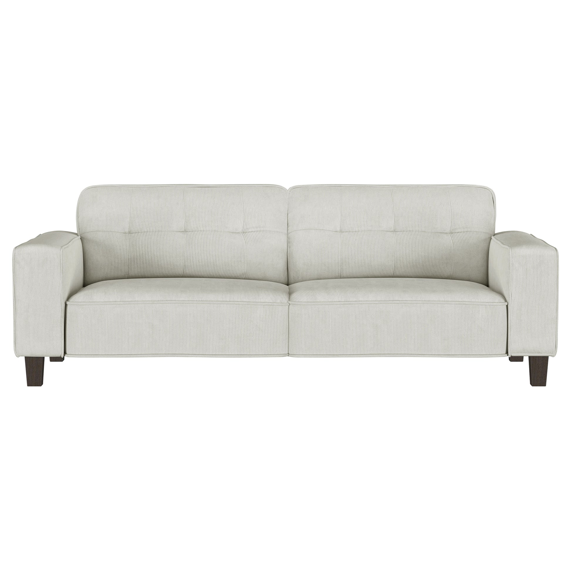 Create a stylish and infinitely comfortable and inviting living space with a modern sofa. Its timeless stance features wide track arms that pair perfectly with plush cushions for an indulgent seating experience. Great for game days, entertaining, or evenings at home, the sofa features plush upholstery with corduroy inspired texture that adds depth and dimension. Back cushions are plush and tufted, offering a grid pattern that's clean and refined. Tapering feet complete the look, offering height that creates an airy finishing touch perfect for modern living.