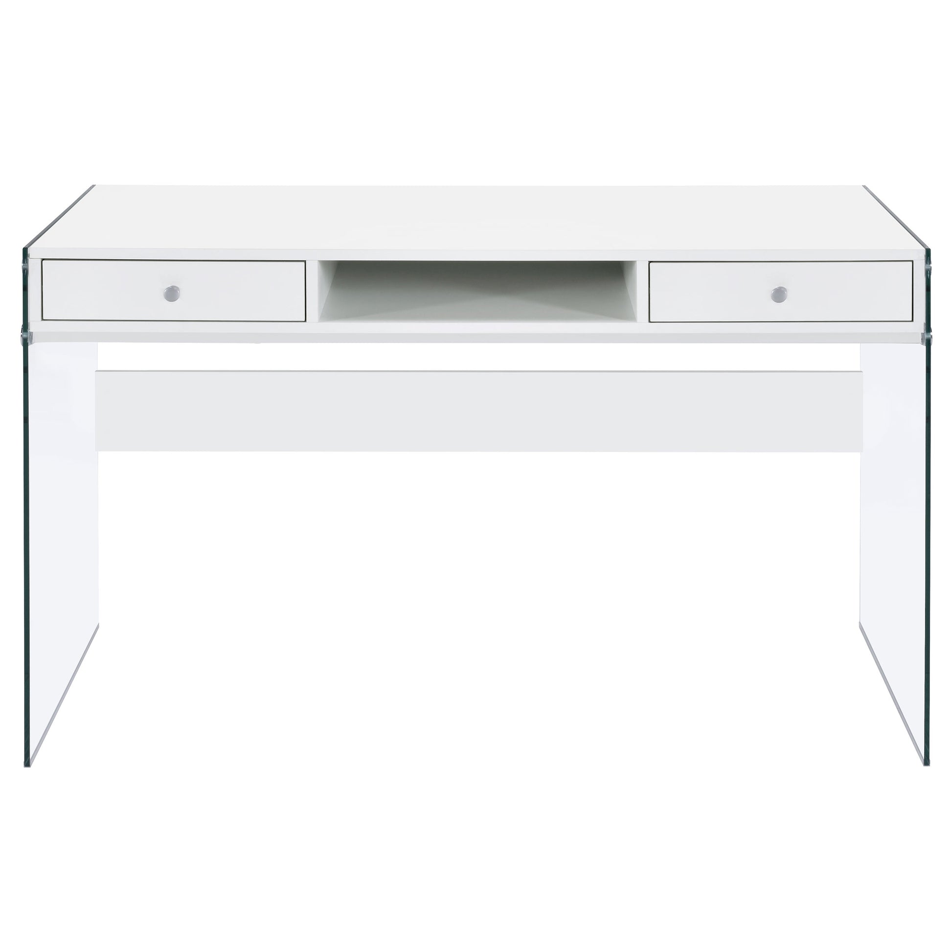 With its cool, contemporary appeal, this versatile writing desk works well in a bedroom or living room. It creates a functional space to work and study without sacrificing style. Bold, thick, tempered glass panels form its base supports, giving it an inspired touch of glamour. Its striking aesthetic is brought to life with a finish of glossy white. This desk is complete with an open center compartment and two drawers, adding extra convenience while maintaining its sleek look.