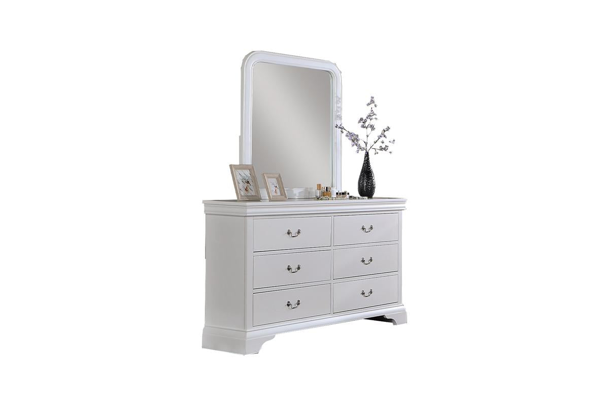 Brilliance and light open your bedroom with this all-white master bedroom set that features six pieces for functional storage and pure relaxation. Each storage unit (Dresser, nightstand, and chest) features a classic design of carved trim and country hardware. The bed frame delivers design excellence with a fully upholstered faux leather unit with 2-panel headboard. Indulge with a quality bedroom set to suit your taste for relaxation. The bed frame is available in the following sizes: Queen, Cali king and Eastern king. Set also includes a mirror for the dresser.