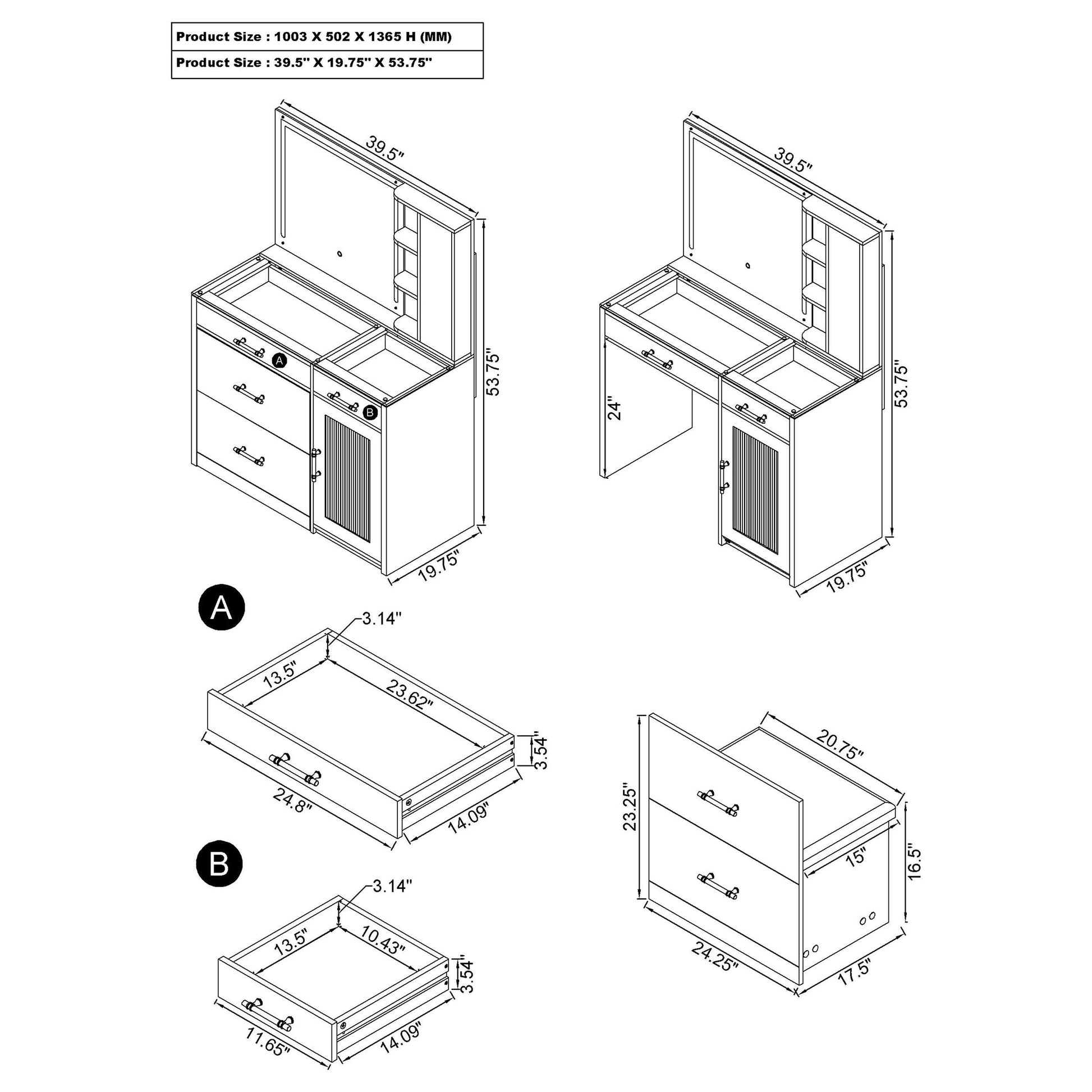 Transform your daily routine with this modern vanity desk, expertly merging sleek aesthetics and smart organization. Its high gloss finish, paired with clear acrylic handles, imparts a bright, contemporary look. Two smooth-gliding drawers and a cabinet with a framed fluted panel and adjustable shelf provide ample storage for cosmetics and styling tools. A tempered glass top keeps the surface pristine, while the integrated LED mirror, activated by a touch switch, ensures flawless lighting for every occasion.