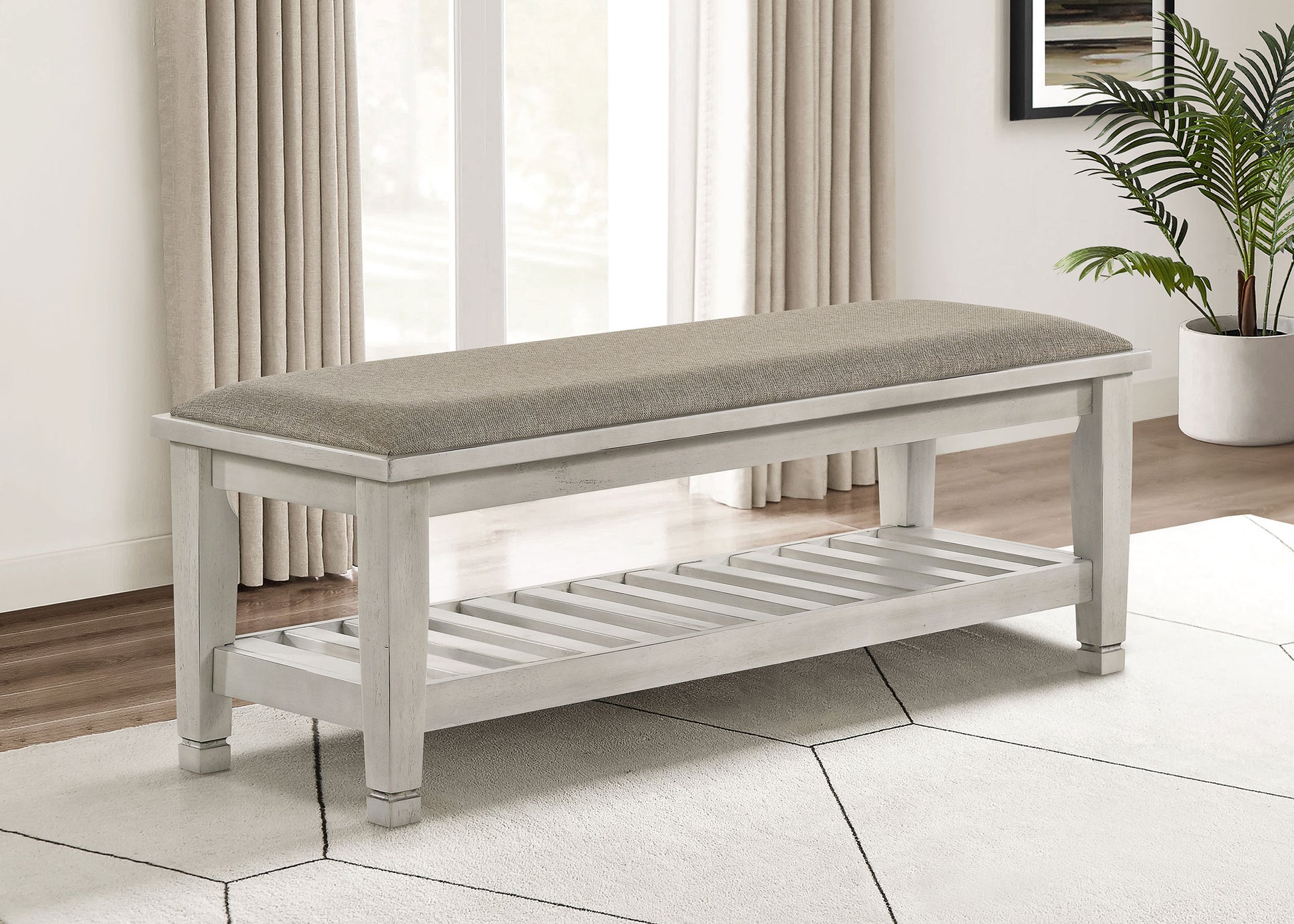 With a cool, transitional design, this bench is a stylish enhancement to any living space. Elegant beveled edges blend appealingly with subtle, tapered legs. A versatile lower storage shelf boasts a classic, slatted wood design. An antique white finish completes its glamorous look. With a soft, cozy seat cushion, this bench is a classy and comfortable choice.