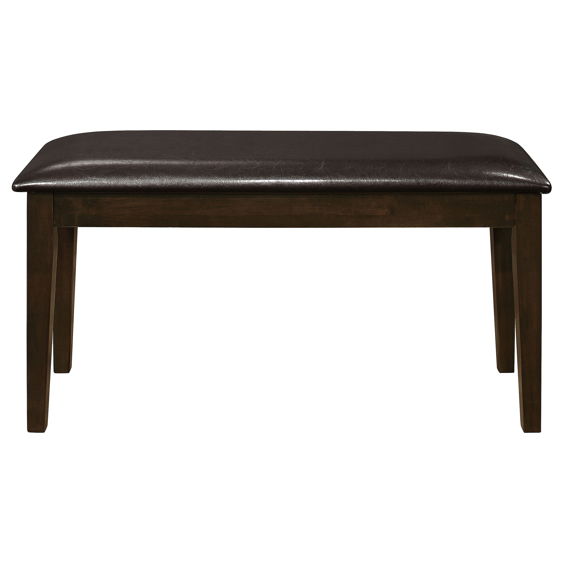 This five-piece dining set brings a perfect blend of everyday comfort and timeless style. Crafted from solid rubberwood, engineered wood, and okume veneer, the rectangular table features clean lines and tapered legs in a rich cappuccino finish. The matching chairs and bench offer padded seats upholstered in dark brown leatherette for a warm, inviting look. Ideal for family meals or casual gatherings, this versatile dining set adds a refined yet approachable touch to contemporary or transitional interiors.