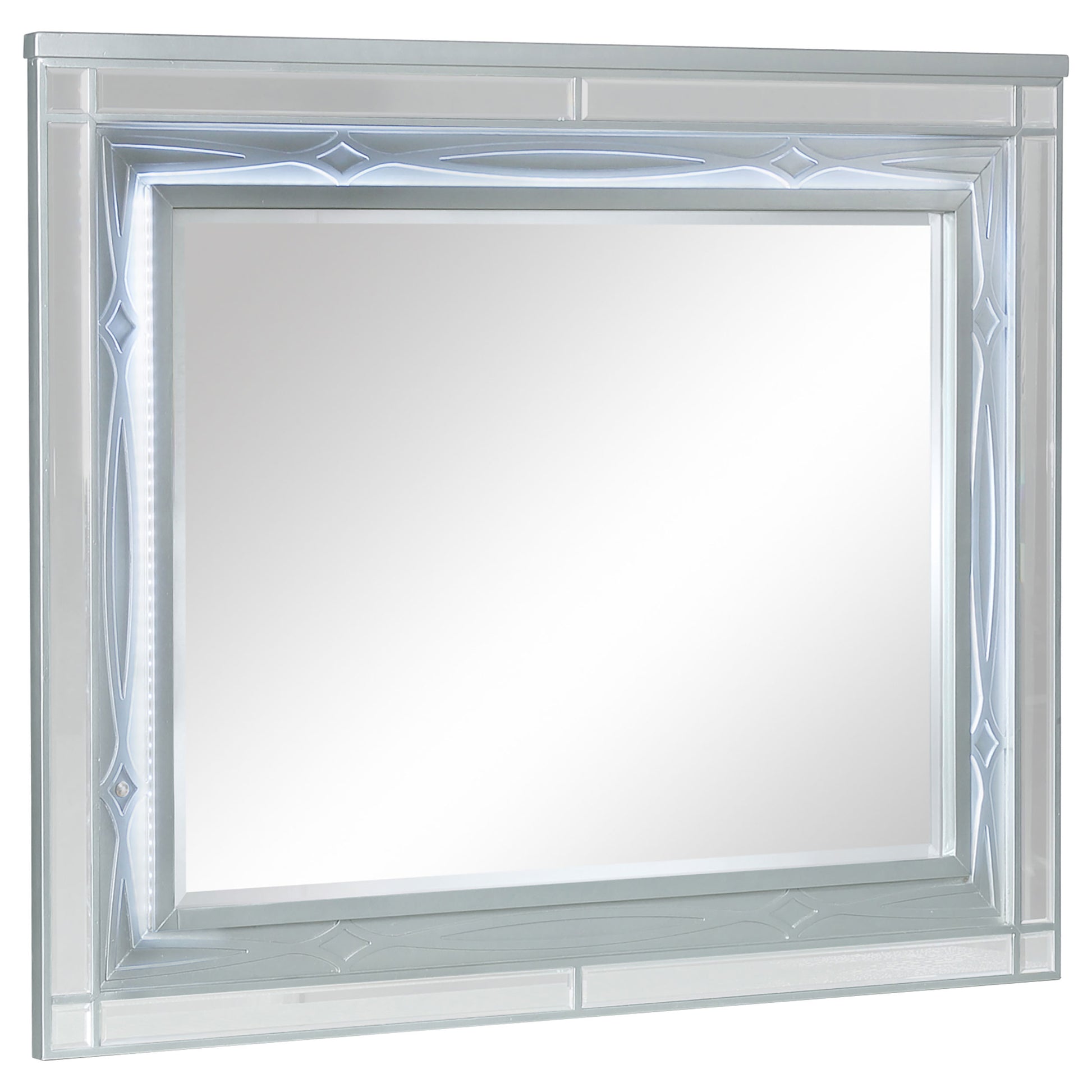 • Silver metallic finish pairs with mirrored trim and crystal hardware throughout