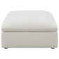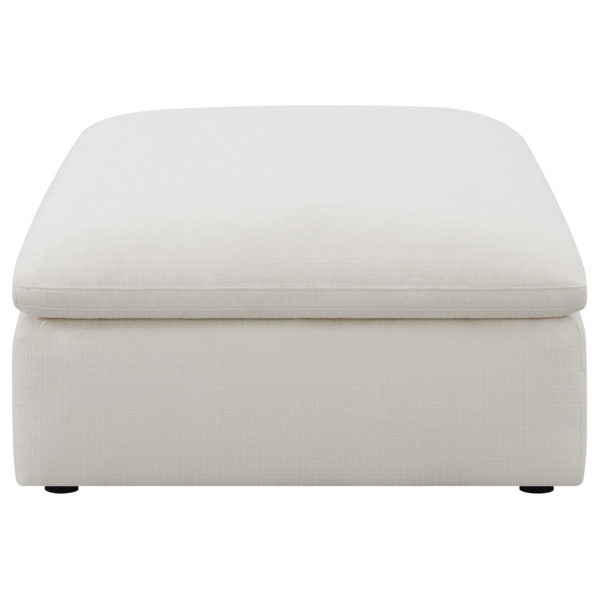 • Square ottoman in ivory fabric with clean lines and refined stitched accents