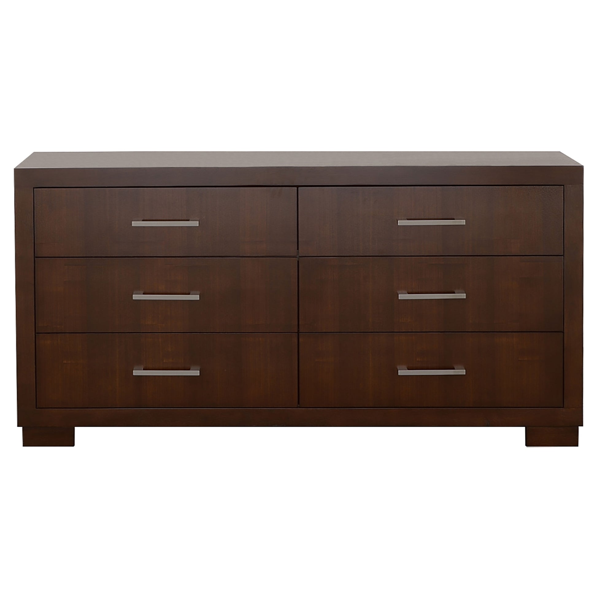 The Jessica wood bedroom set blends smart storage and sophisticated design for a refined modern retreat. Featuring a platform bed with a built-in bookcase headboard and integrated LED lighting, it offers both form and function. Each coordinating case piece is crafted from rubberwood, engineered wood, and ash veneer, complemented by silver-tone hardware for a contemporary touch. The rich cappuccino finish adds warmth, while English dovetail drawers with felt-lined tops provide practical, lasting elegance.