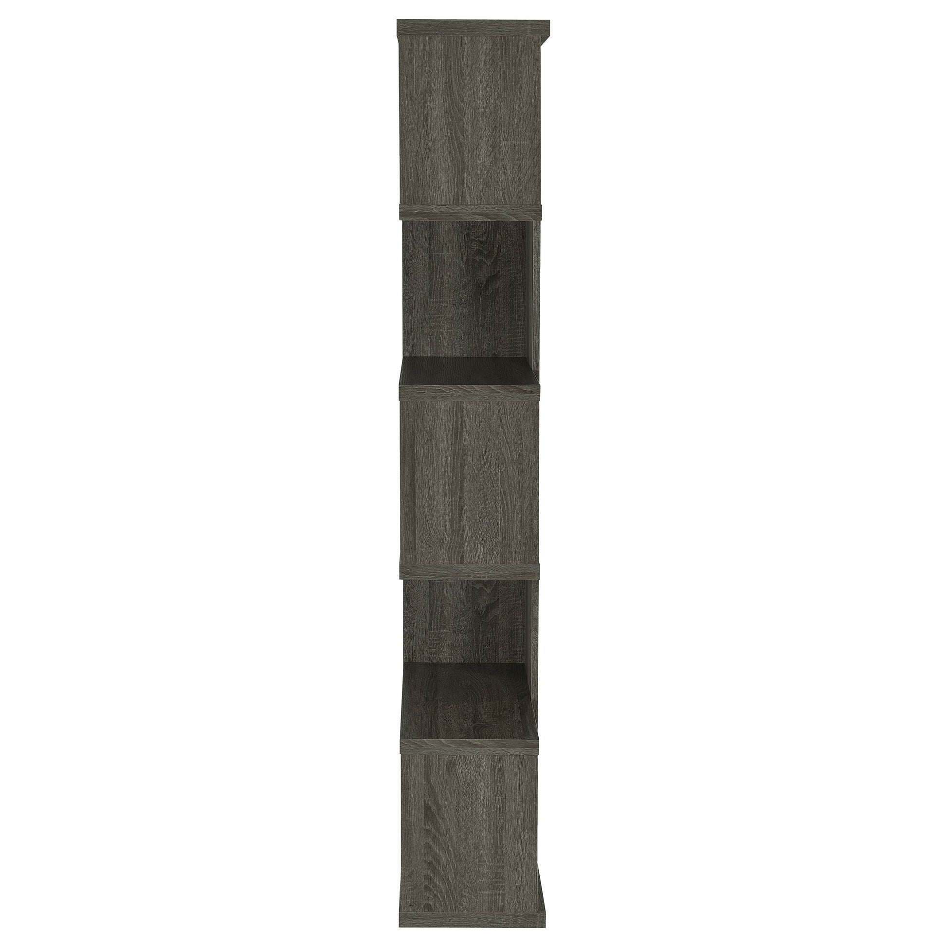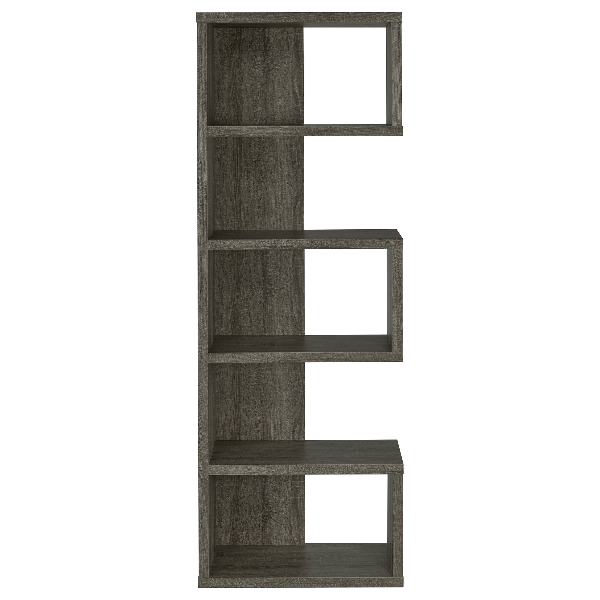 Purposeful imbalance tells a story. Designed with a whimsical profile, this bookcase brightens up a contemporary space. A visually pleasing arrangement of five tiers creates shelf space for books and decor. Finished in a cool weathered grey, it provides versatility and design power. Make this bookcase a focal point in a home office or casual room.