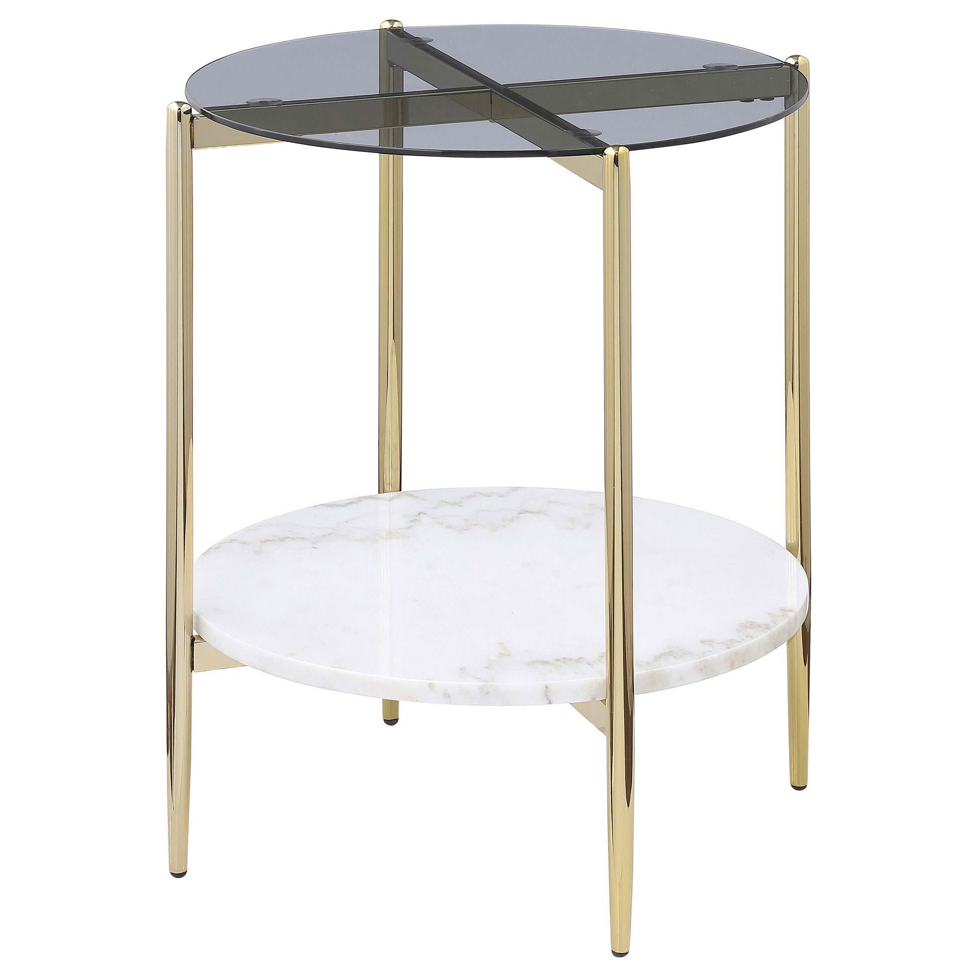 Jonelle Round Glass Top End Table White Marble Shelf Gold