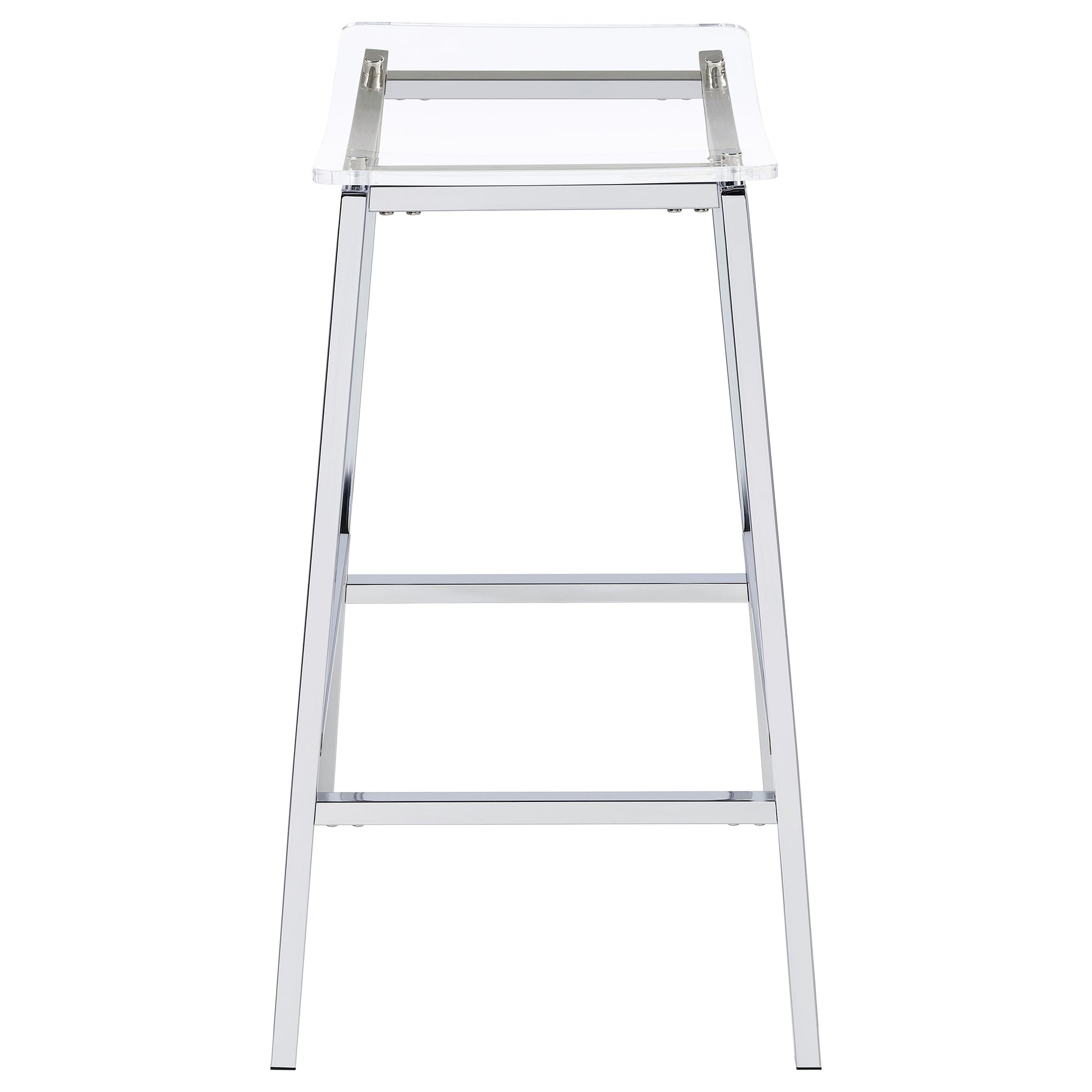 Updated to reflect the carefree contemporary style you crave, this set of two bar stools uses modern materials and finishes to bring a crisp look. Perfect for casual seating at a bar table or counter, these stools are lightweight yet sturdy. Gleaming chrome finish metal framing includes a two-bar seat support and built-in footrests. A gently curved seat made of acrylic reveals the nuts and bolts of metal framing. Add this bar stool set to your easy-living space for entertaining and family meals.