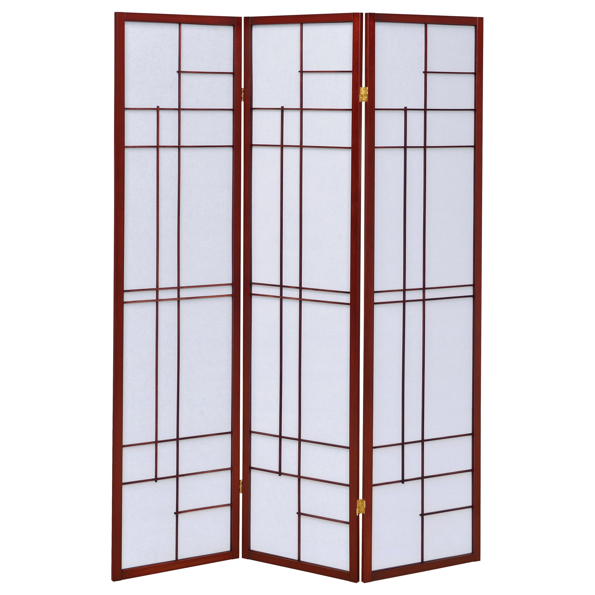 Enhance your space with this Japanese-inspired three-panel shoji screen, designed with slim linear details that create a striking geometric look. The warm cherry-finished wood frame offers a rich contrast against the crisp white paper panels, blending traditional style with contemporary appeal. Flexible hinges allow the panels to fold and adjust, making it perfect for dividing a room, adding privacy, or serving as an accent piece. Crafted from FSC-certified rubberwood with durable fabric, this screen balances function and artistry.
