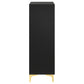 Organize garments, bed linens, and much more in this modern glam chest. Space-saving and tall with a simple, boxy frame, this five-drawer chest keeps your bedroom floor space open and free. A smooth, black finish presents a bold contrast and dramatic flair to focal walls and spaces. Each of the five spacious drawers is fastened with a chic, gold finished pull handle that lends a warm metallic accent. Bracket style legs mirror the golden metallic hues, offering a slight elevation and extra support to this stunning modern five-drawer chest.
