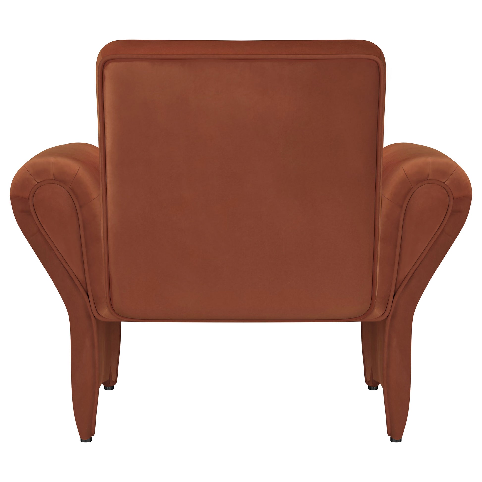 Play with color when you choose the bold hues of a modern accent armchair. In deep rust, it boasts velvety soft upholstery and a sculptural silhouette that blends timeless design elements to create a look that's new and fresh. A pair of rolled arms are delicately flared to create a teardrop effect. This detail highlights the slim nature of its panel legs, offering light, airy character to a robust seat and slender back. Choose the perfect placement for an armchair designed to stand out.