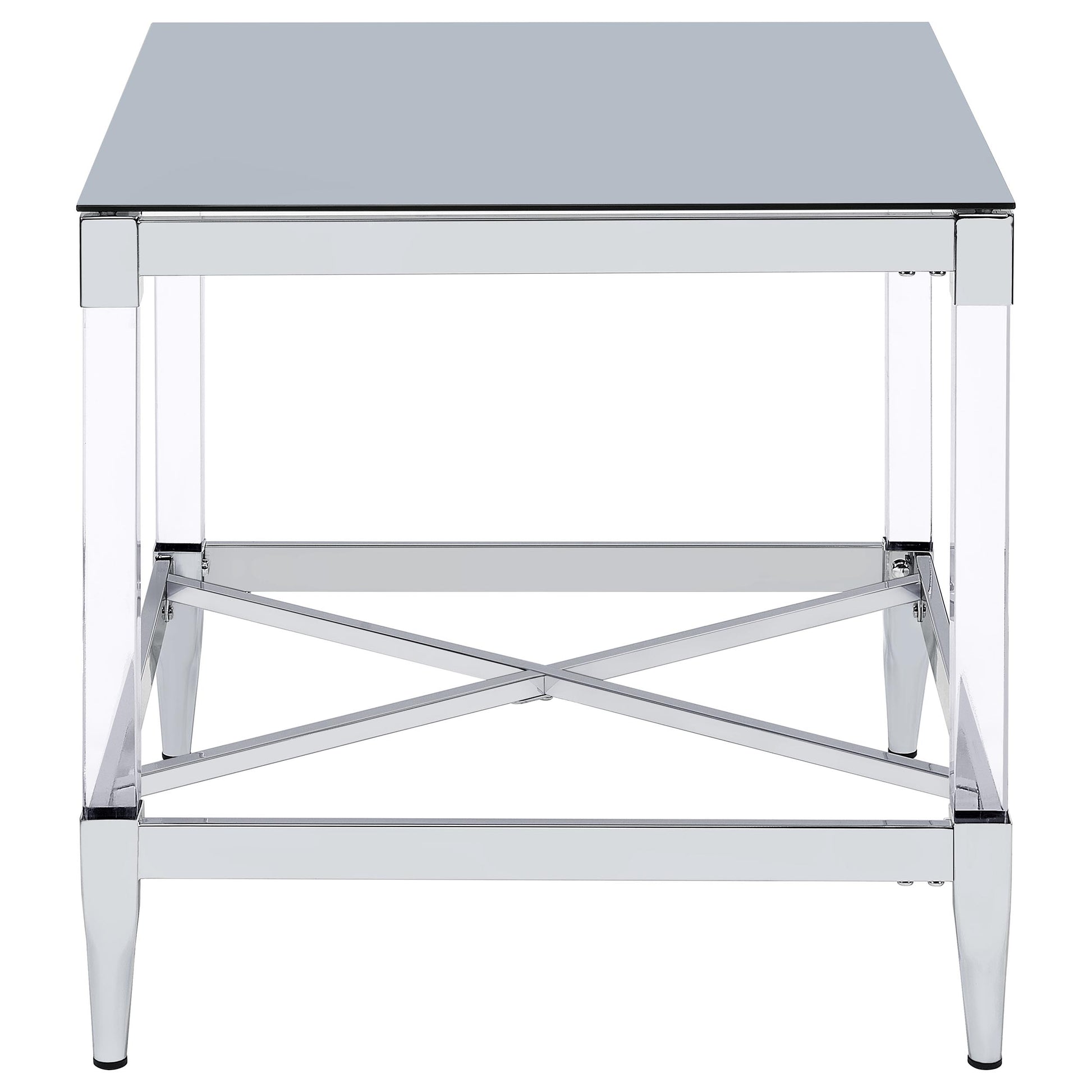 Transform your living room with this coffee table set, a stunning combination of mirrored tempered glass tops and chrome-electroplated frames. The coffee table and end table feature square tops that reflect light and color, creating vibrant focal points. Clear acrylic leg posts add an airy, floating aesthetic, while tapered feet provide stability and elegance. Designed for modern interiors, this set combines contemporary artistry with practical functionality.