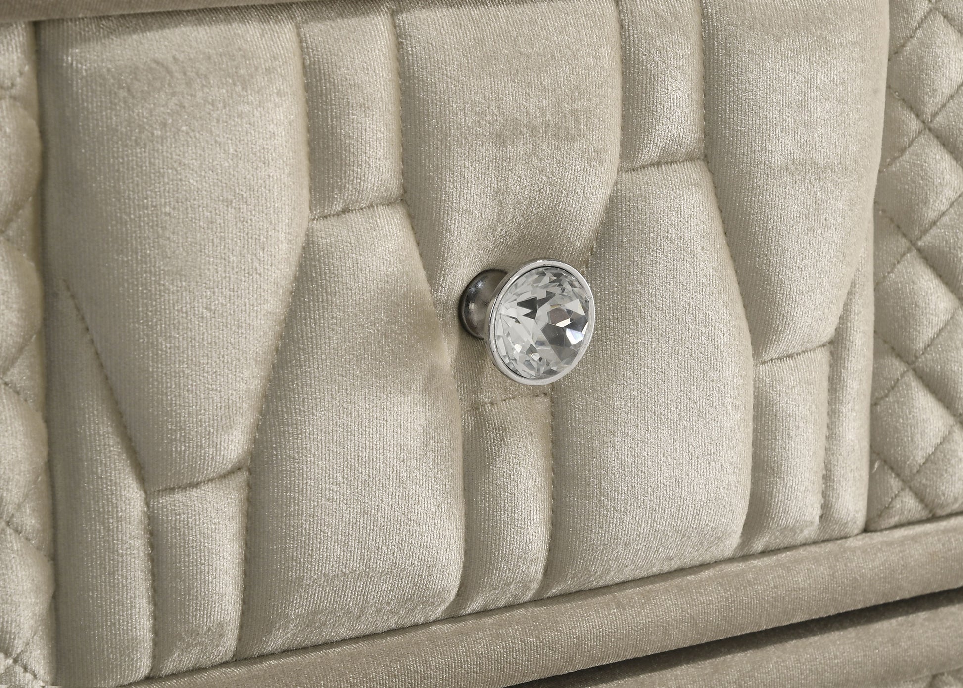 Warmth meets radiance in this dresser and mirror set, where ivory and camel velvet surround every surface. A built-in flame visualizer sits beneath a clear tempered glass top, with LED case lighting adding atmosphere. The tri-panel mirror features LED illumination to complete the glow. Finished with crystal knobs, quilted velvet fronts, and felt-lined drawers, this set pairs soft elegance with practical brilliance, all lifted by solid rubberwood legs.