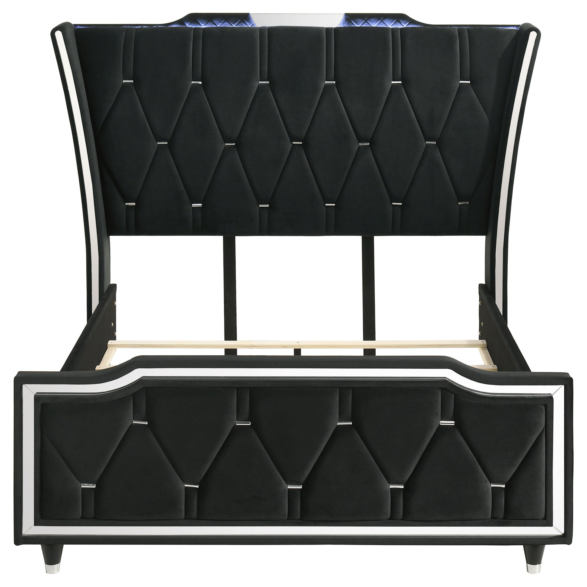• Headboard features deep button tufting and integrated LED crown accent lighting