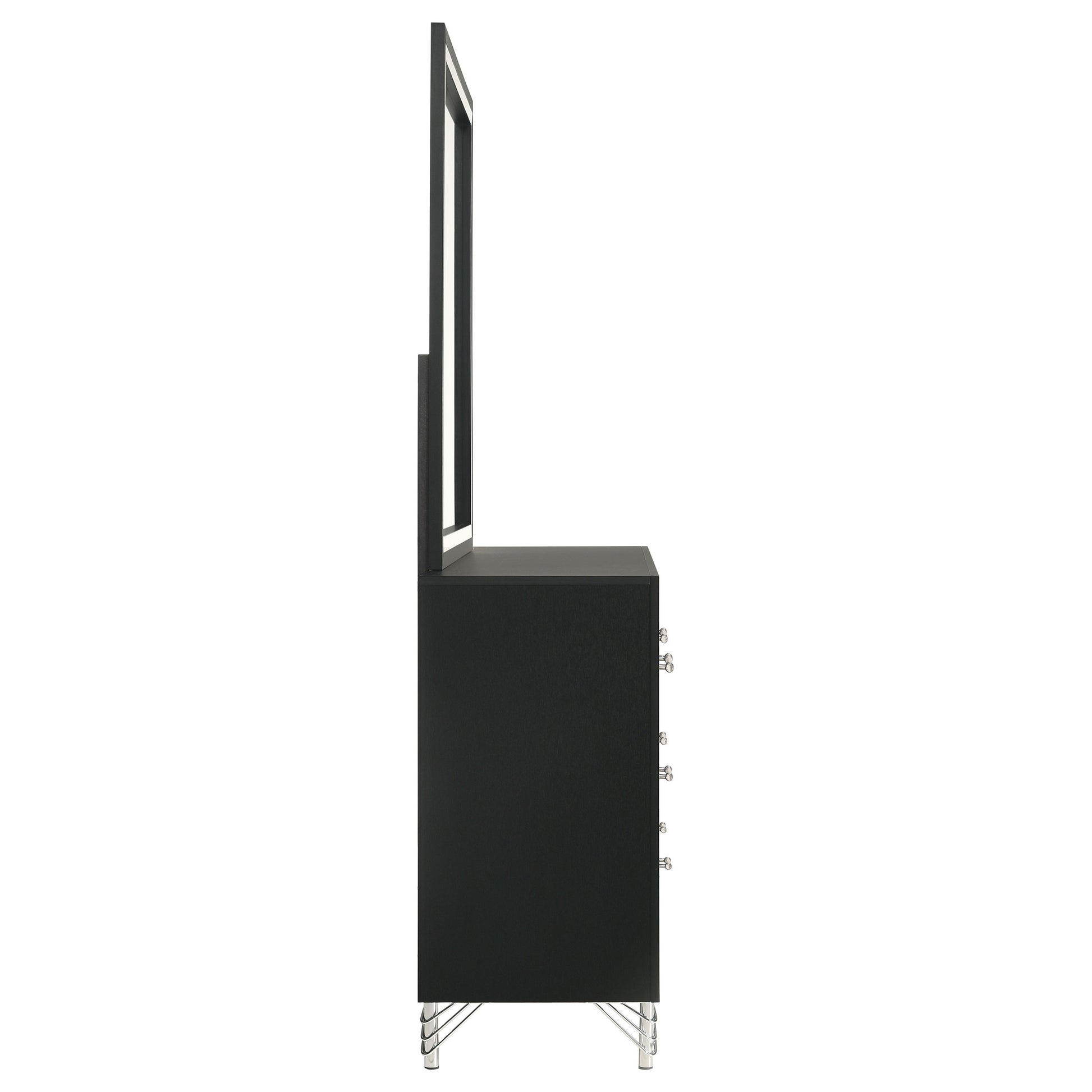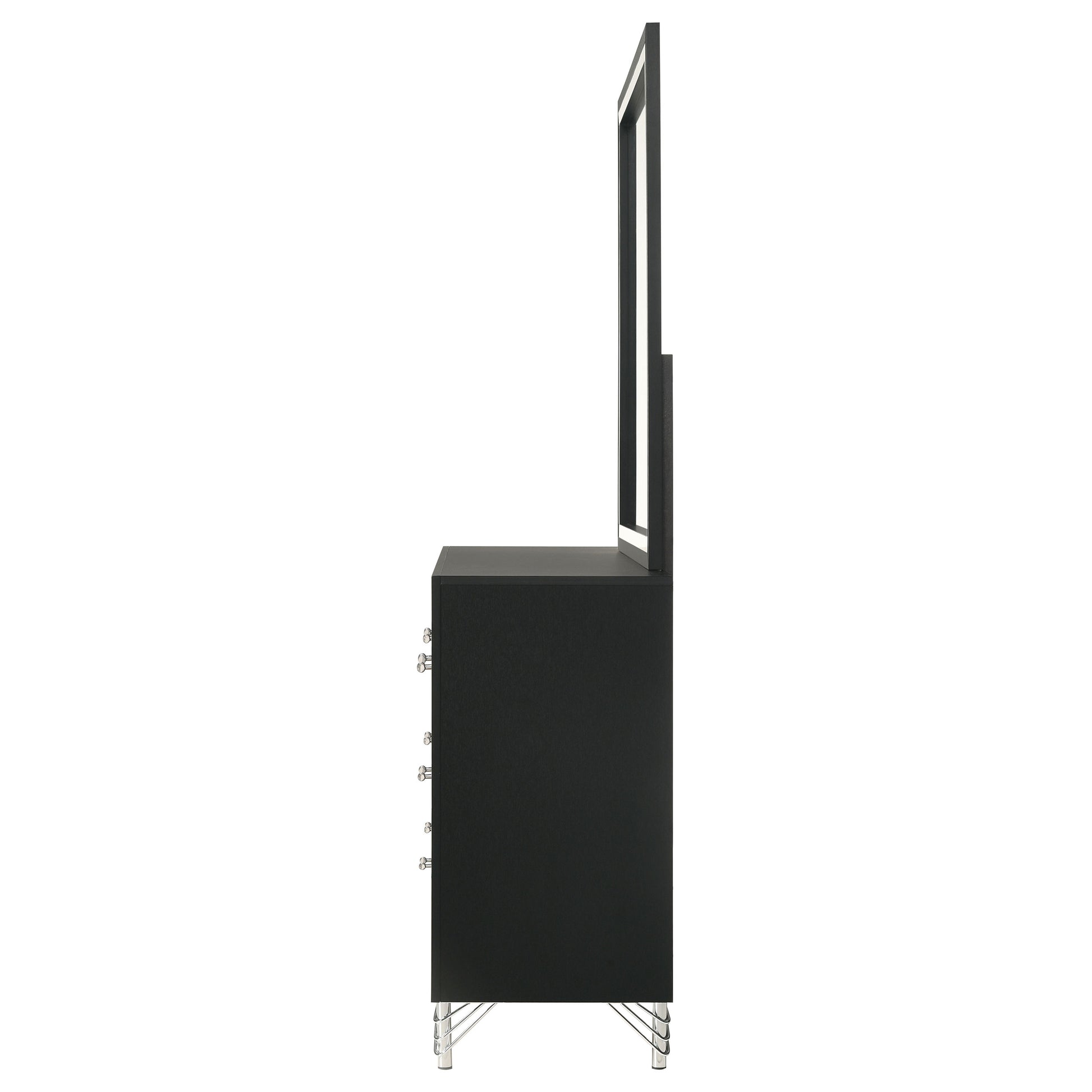 Introduce sophisticated and a hint of glamour with a modern six-drawer dresser and mirror set. Perfect for your stylish bedroom, it offers roomy drawers with smooth interiors perfect for clothing and accessories. The dresser features a bold black finish, with bands of shiny chrome trim and matching hardware and legs. The mirror on top is framed to match the front of the case, creating a sense of cohesion and richness in your dressing area. Decorative legs add a glam touch while the wide top is ideal as a vanity or for decor.