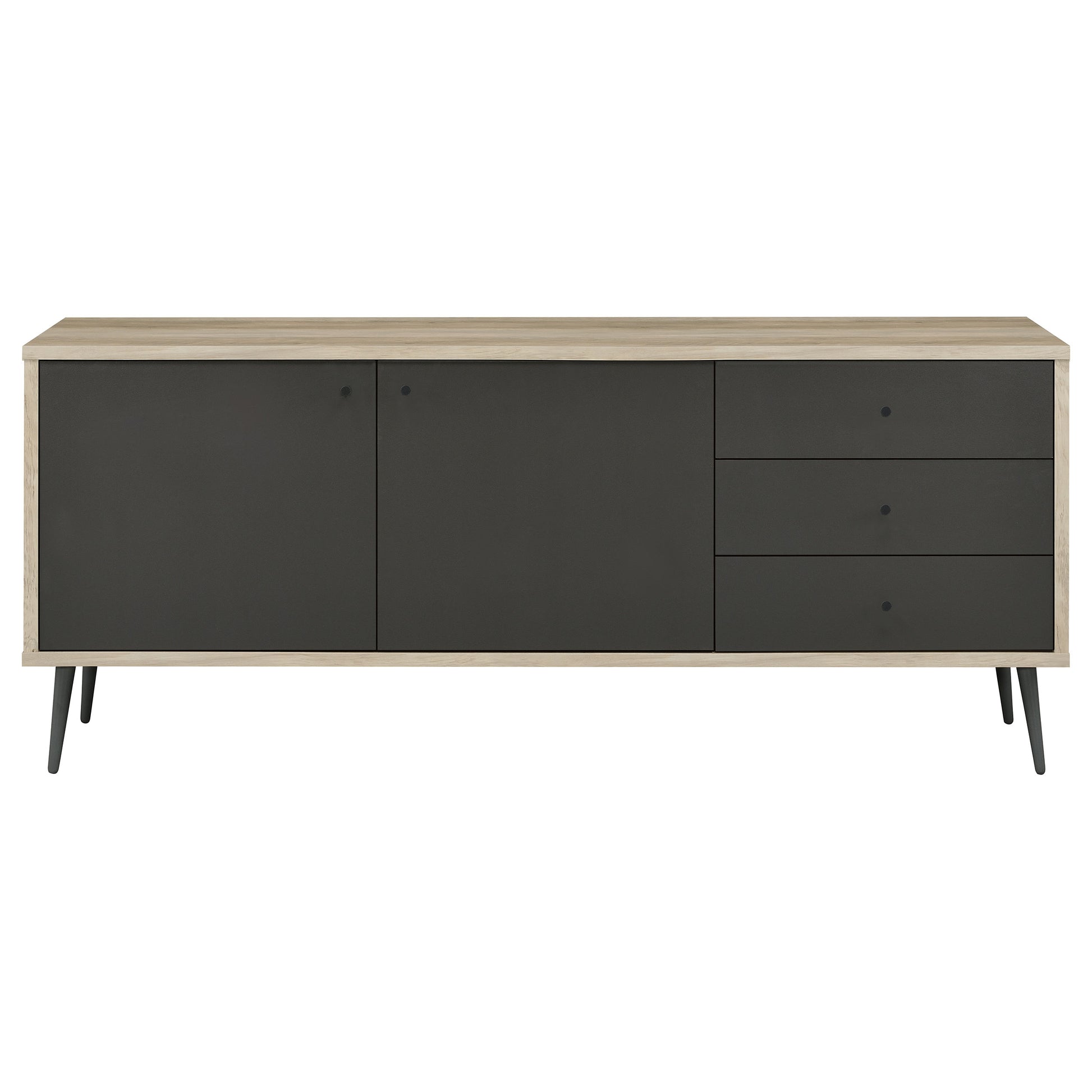 Light, airy energy and minimalist Scandi design combine to create a chic storage solution for any room. A modern accent cabinet features a pine wood finish case that's cool and neutral, perfect for a living or dining room. Door and drawer fronts add a contrasting antique gray finish that's rich and elegant, offering contrasting color and style for a stand-out look. Two doors open to reveal two shelves, great for everything from dinnerware to clothing and accessories. Three drawers create the perfect spot for smaller items, adding organization in an entry or home office.