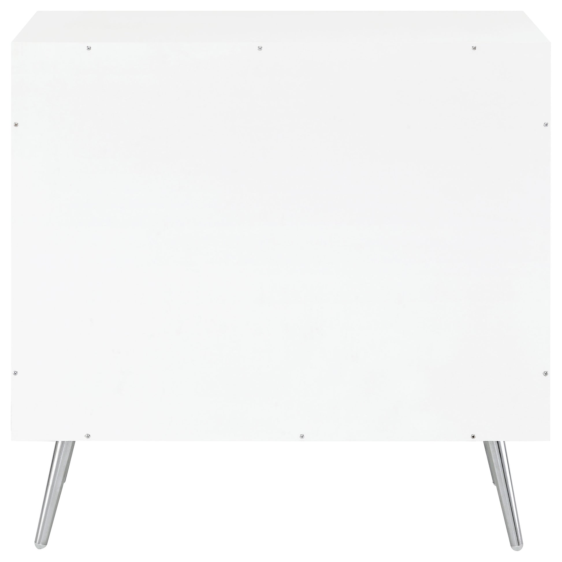 Step into a world where classic charm meets modern elegance with this 2-door accent cabinet. The crisp white finish on engineered wood construction is beautifully complemented by the textural contrast of rippled doors. Tapered steel legs, electroplated in chrome, give rise to two tiers of shelving, including a tempered glass shelf, all crowned with chic acrylic crystal knobs. This piece is not just a storage solution, but a statement that adds a touch of sophistication to any space.