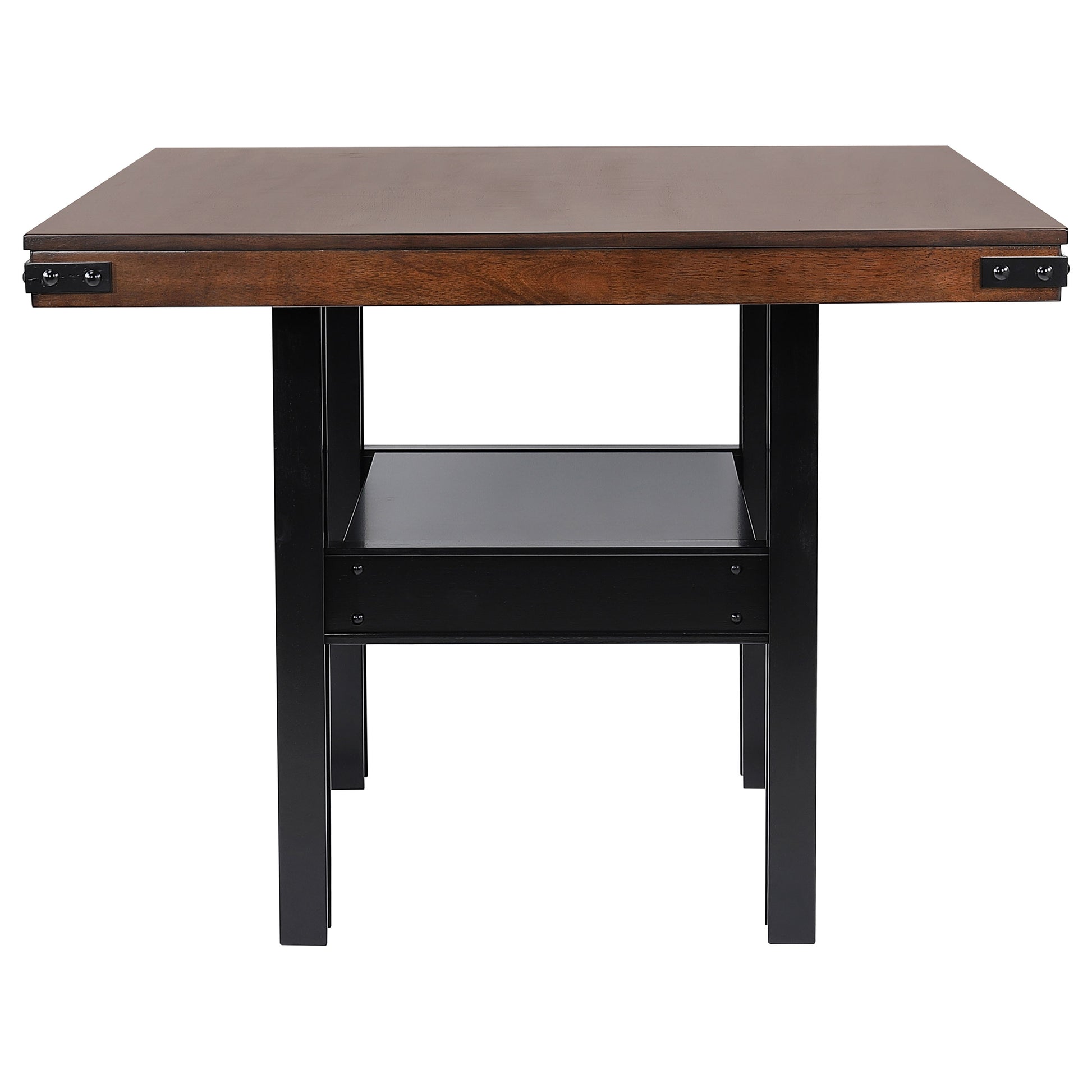 Center a stylish, inviting dining space around this modern industrial counter height dining table. It's a fresh, two-tone design with charming details that offer elevated aesthetics in your kitchen or dining room. The table features a rectangular top crafted with sap walnut veneer in a mango oak brown wood grain finish. Strap and bolthead details add charm to the apron, creating a sense of texture and dimensionality. The base of the table takes a page from architectural framing and offers a black finish and a shelf that's perfect for stashing essentials.
