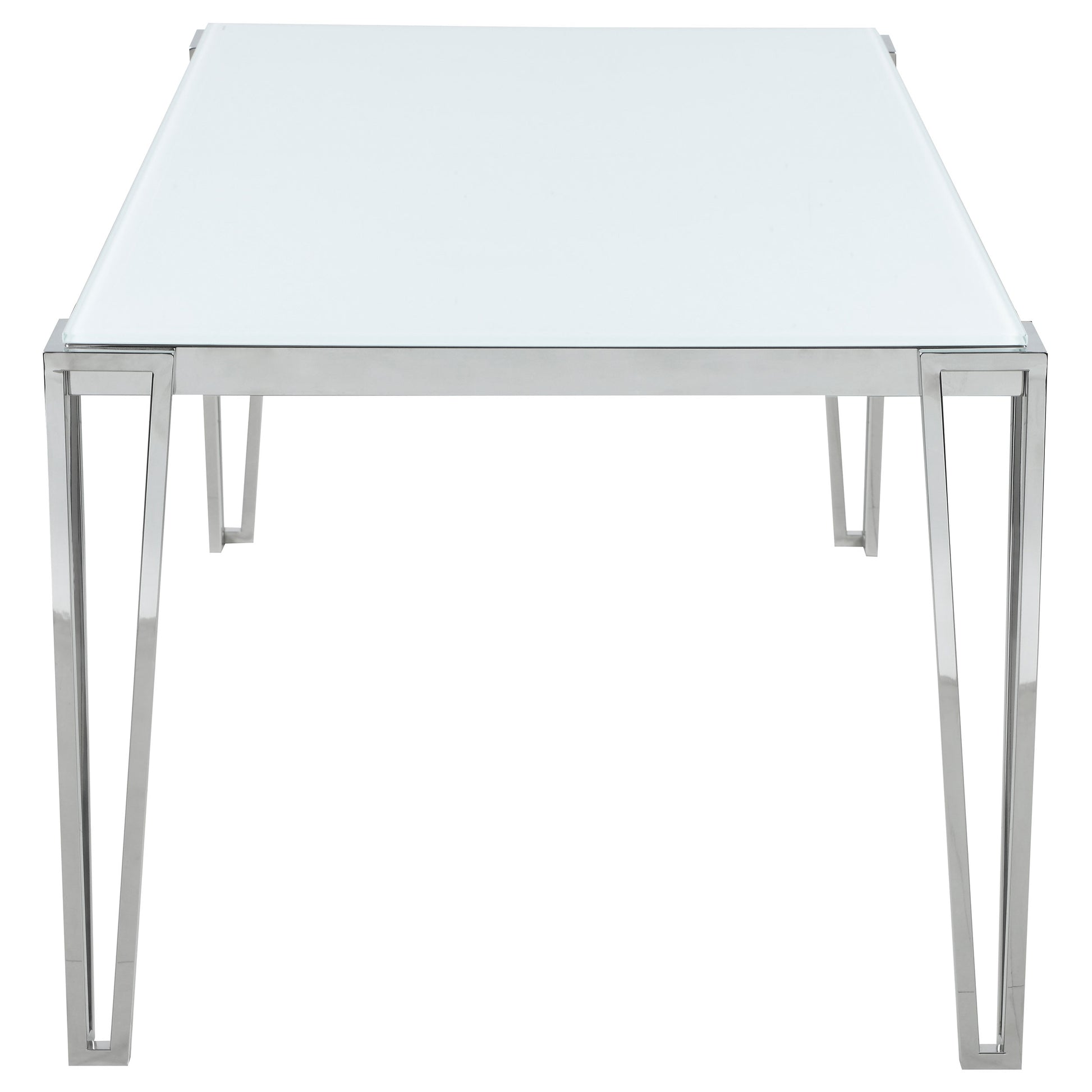 Clean lines and sleek materials give this dining table a distinctly modern edge. The white frosted tempered glass top offers a bright, airy look, while the polished stainless steel frame delivers durability and shine. Designed with geometric, hairpin-inspired legs, this rectangular dining table comfortably seats six and suits both casual and formal dining spaces with effortless style.