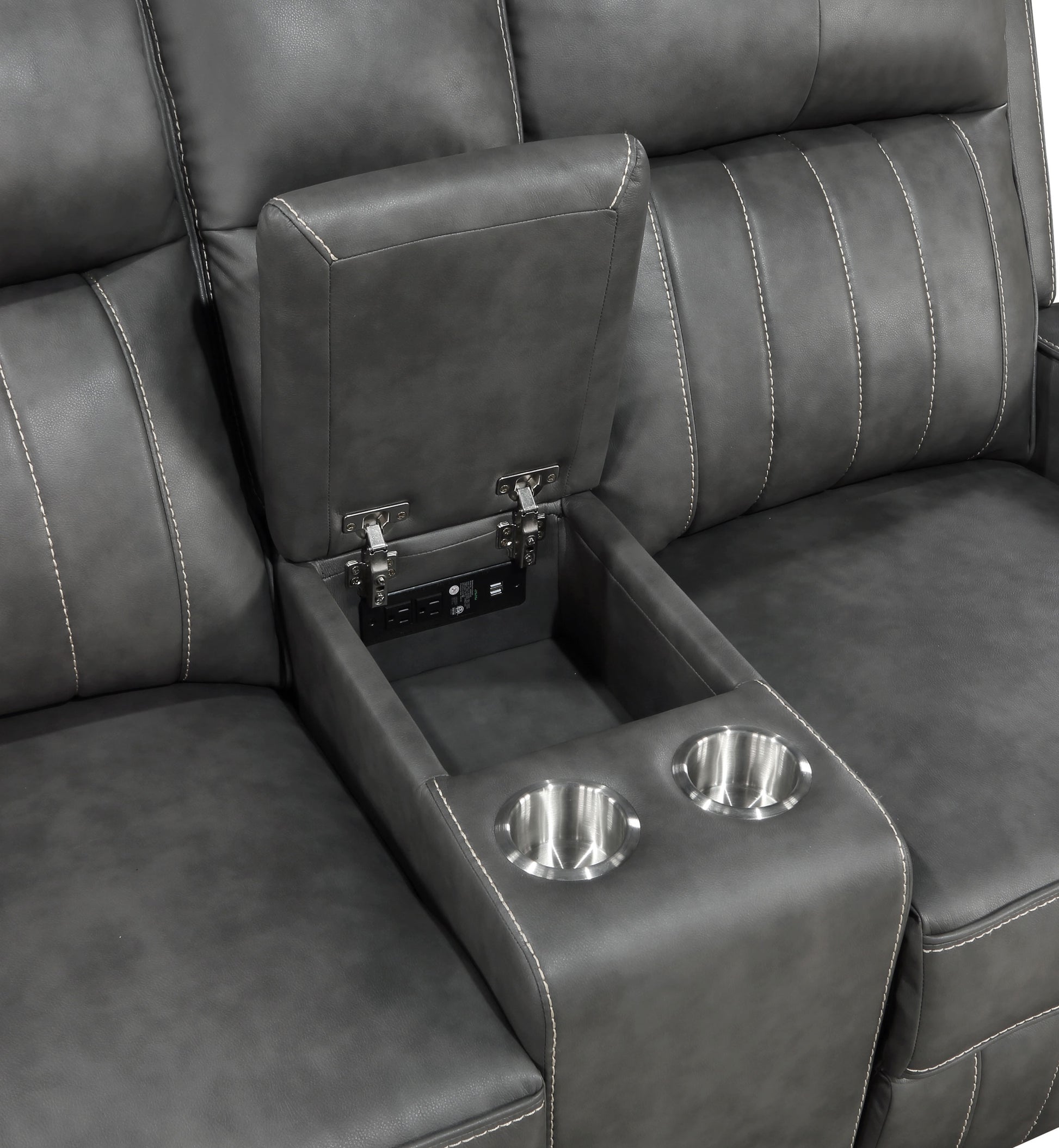 Relax in style with this transitional motion sofa set that blends modern and contemporary design. Each piece is upholstered in smooth grey leatherette with vertical topstitching for decorative detail and added dimension. Plush foam padding and pocket coil seating provide long-lasting support, while ultra-padded headrests enhance comfort. Manual reclining seats with a wall-hugger design maximize space efficiency. For added functionality, the loveseat includes a center storage console with dual cup holders.