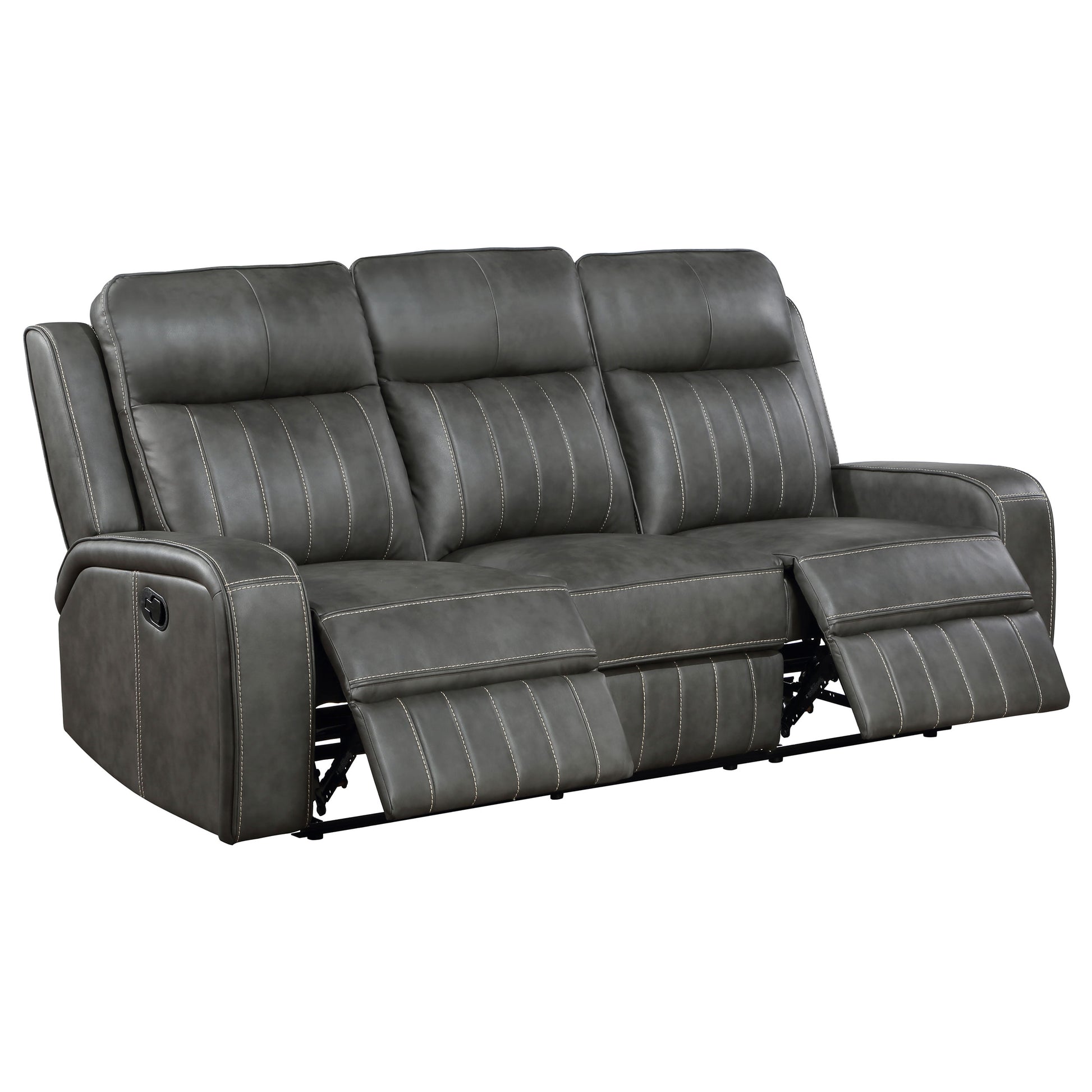 Relax in style with this transitional motion sofa that blends modern design and everyday comfort. Upholstered in smooth grey leatherette, it features decorative vertical topstitching for added dimension and appeal. Plush foam padding and pocket coil spring cushions provide long-lasting support, while ultra-padded headrests enhance relaxation. A wall-hugger reclining mechanism saves space, making this sofa a smart fit for any living area. Manual reclining allows customized comfort with ease.